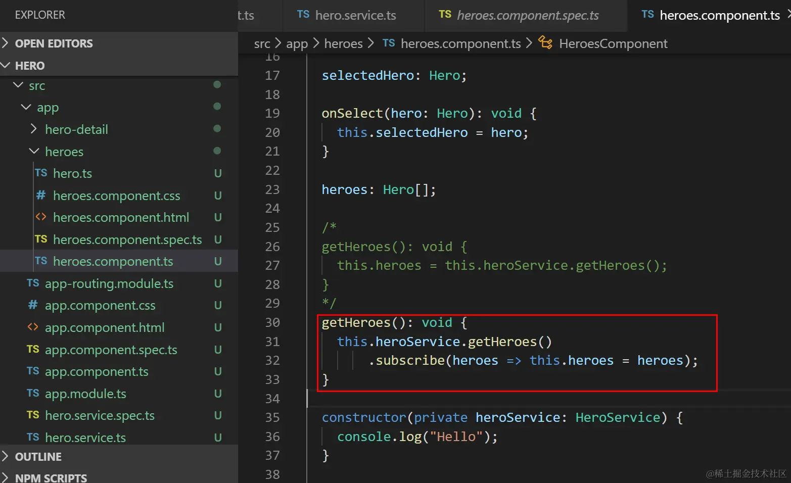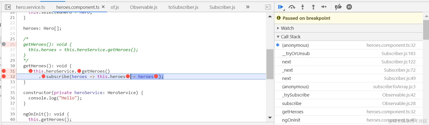 第32行,调用OBservable API的subscribe方法,方法接收一个回调函数,设置Component的heroes属性为Observable里包裹的数组。