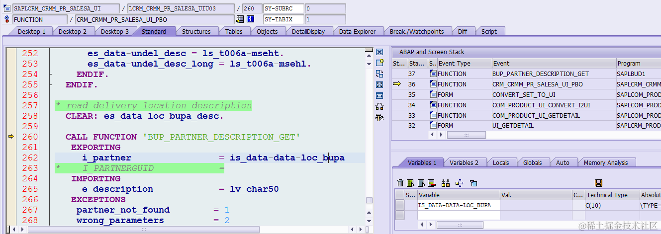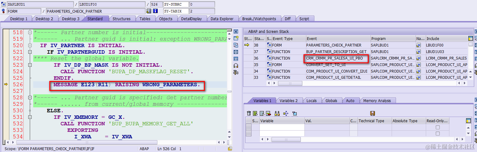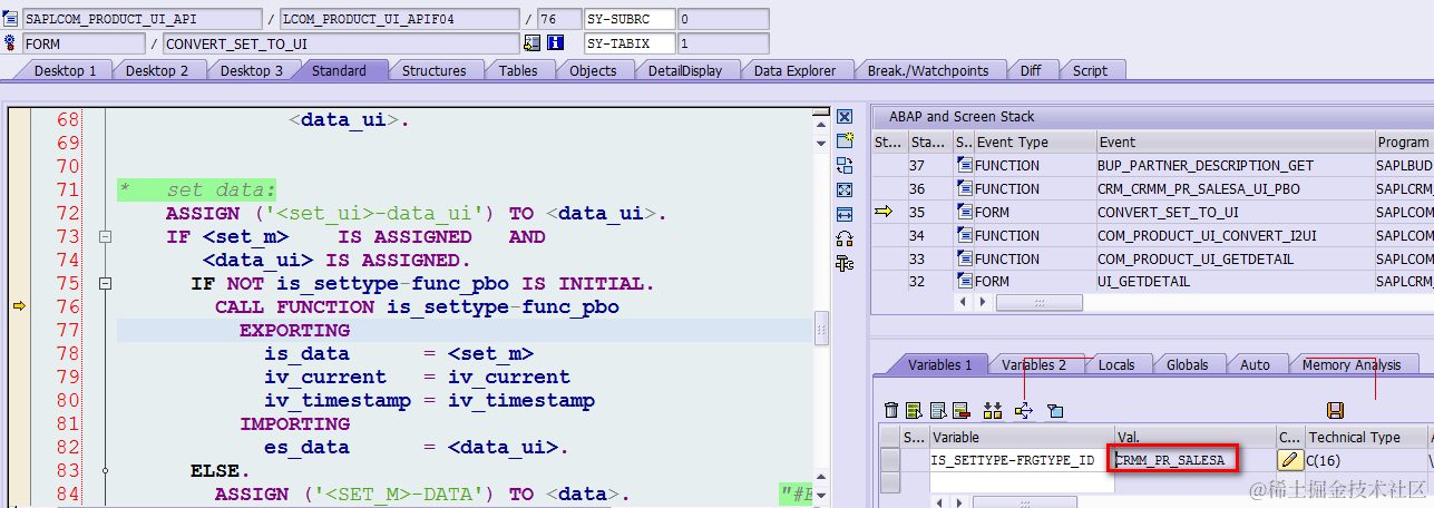 After that click F8, then debugger automatically stops at the very line where the specified error message is raised. From the callstack I know that this error occurs when WebUI framework tries to retrieve the data of set type CRMM_PR_SALESA: