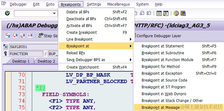 Now I have to set a break point on a given method which is executed before this error message is raised. I choose to set break point on method CL_BSP_WD_VIEW_MANAGER~PROCESS_NAV_QUEUE. After this break point is triggered, set a dynamic break point via context menu below: