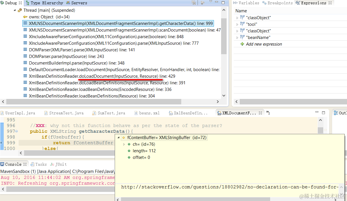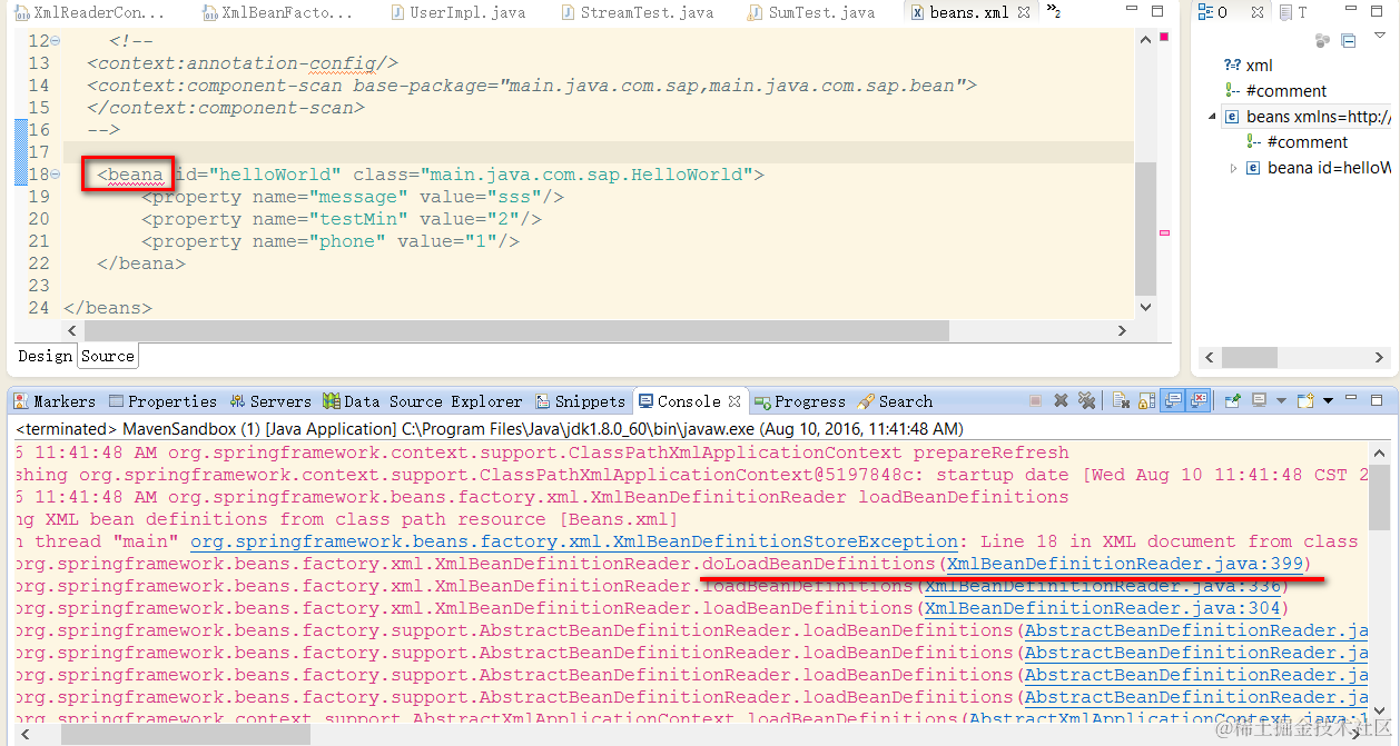 Where can we set breakpoint to start? No hint. Here is a tip: we can make the Beans.xml invalid by deliberately changing te tag bean to beana, and relaunch application. Now exception is raised as expected: Click the hyperlink XmlBeanDefinitionReader.java:399,