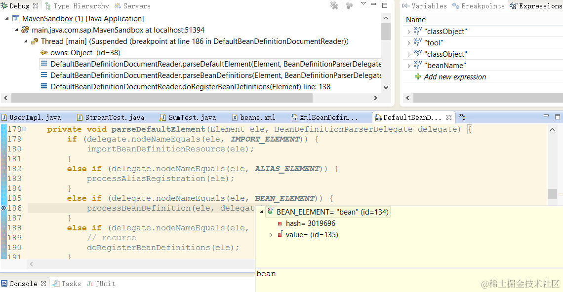 Change the tag from beana back to bean, and start application via debug mode. The code below is the core logic of Bean configuration file parse in Spring framework. The logic consists of two main steps: