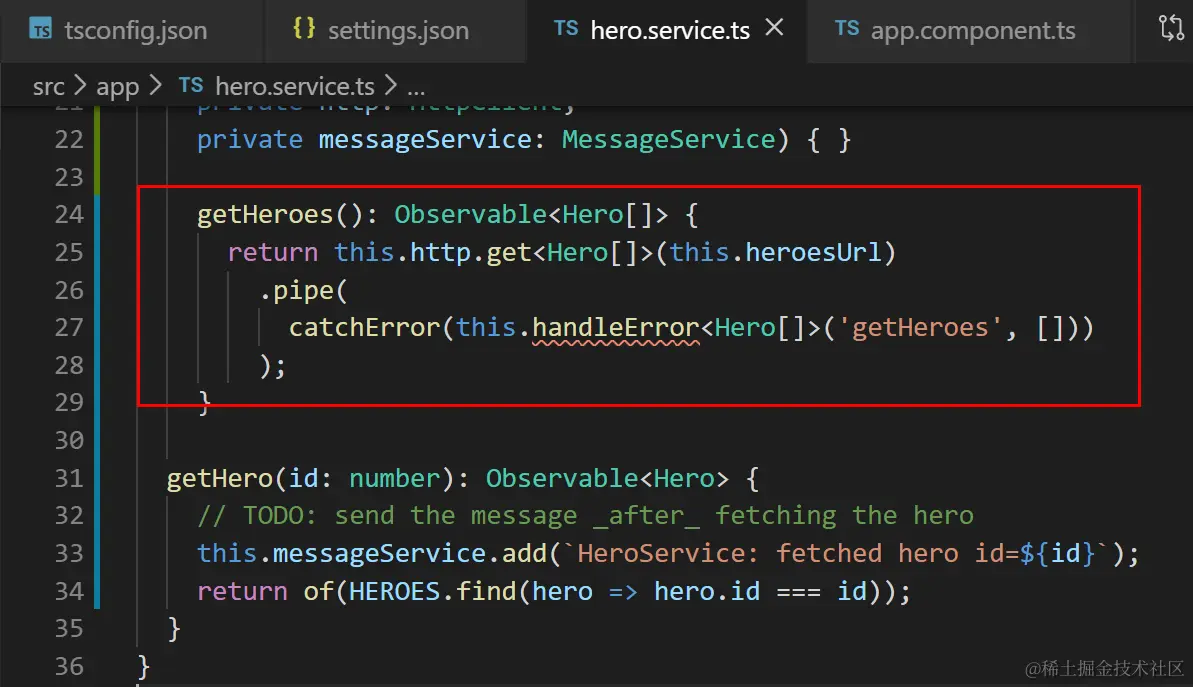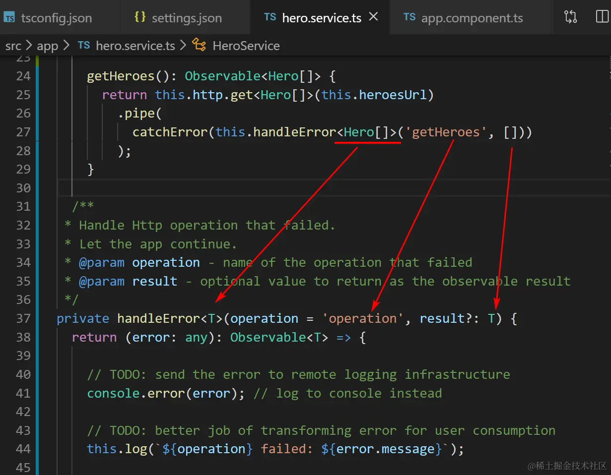 catchError(this.handleError<Hero[]>('getHeroes', []))