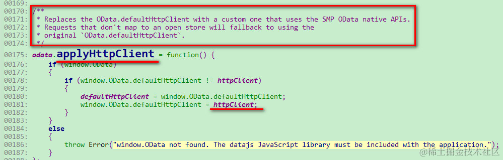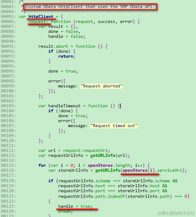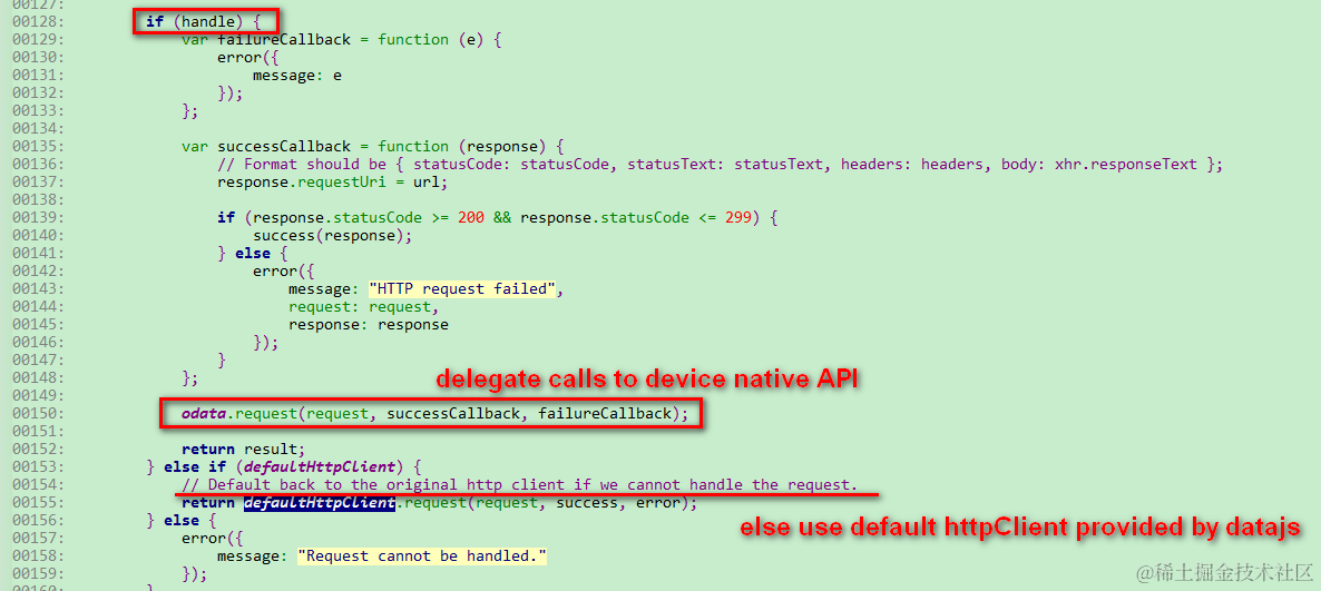 A new httpClient is defined. Inside its request method, the requested url is compared against each offline supported url configured in array openStores. If matched, a flag handle is set as true.