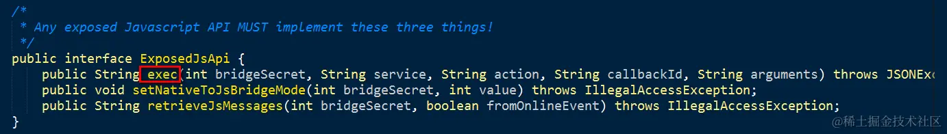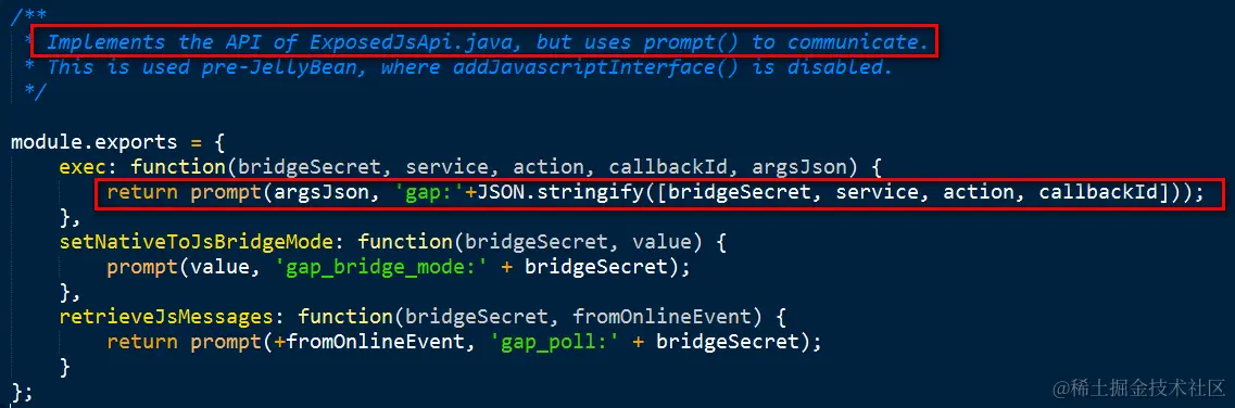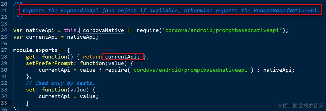 Again look at implementation in nativeapiprovider.js, from the comment in line 21 we can know the currentApi returned by get comes from either ExposedJsApi.java or PromptBasedNativeAPI.