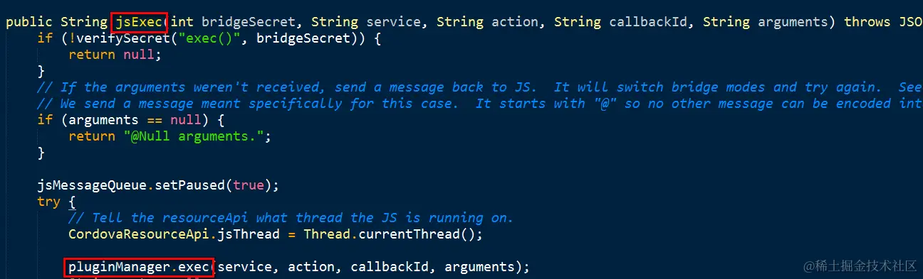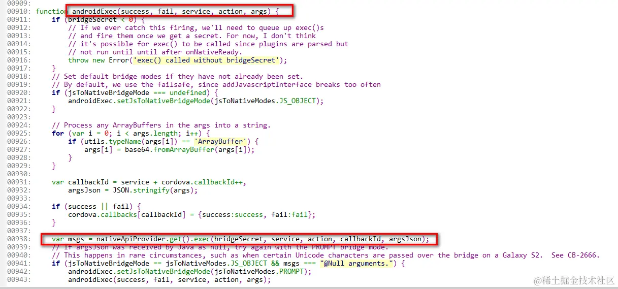 var msgs = nativeApiProvider.get().exec(bridgeSecret, service, action, callbackId, argsJson);