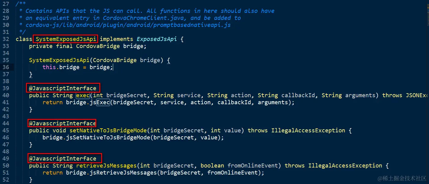 And the Java class SystemExposedJsApi implements the interface, delegates call to the instance of class CordovaBridge.