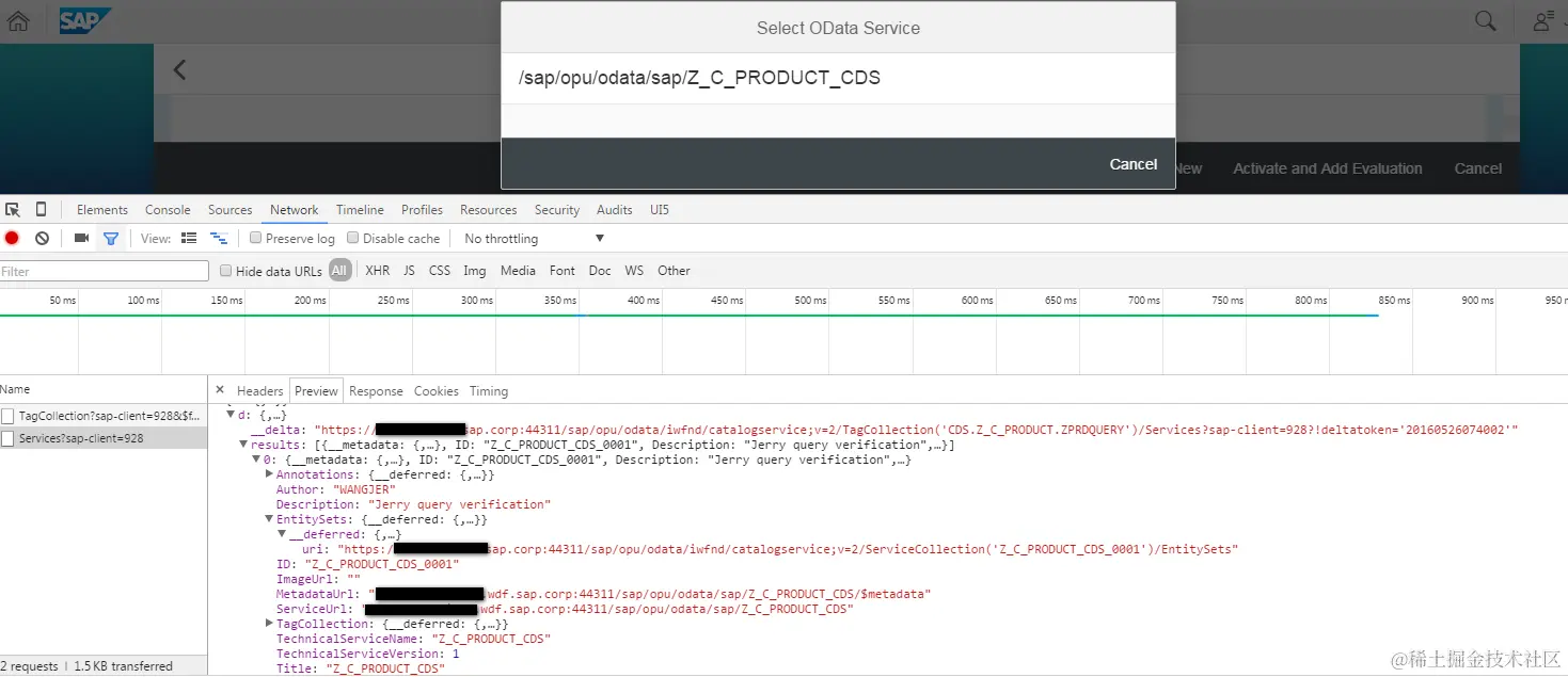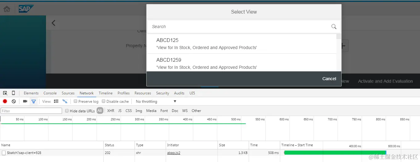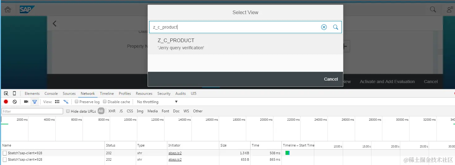 Since my CDS view “Z_C_PRODUCT” does not appear there, so I type it manually and click search icon. A second batch request is sent: