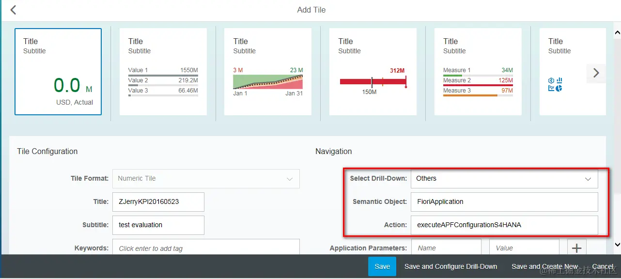 Here in navigation property maintenance area, select Drill down as Others and specify Semantic object and action as the same value you have entered in step 2. Save this tile configuration.