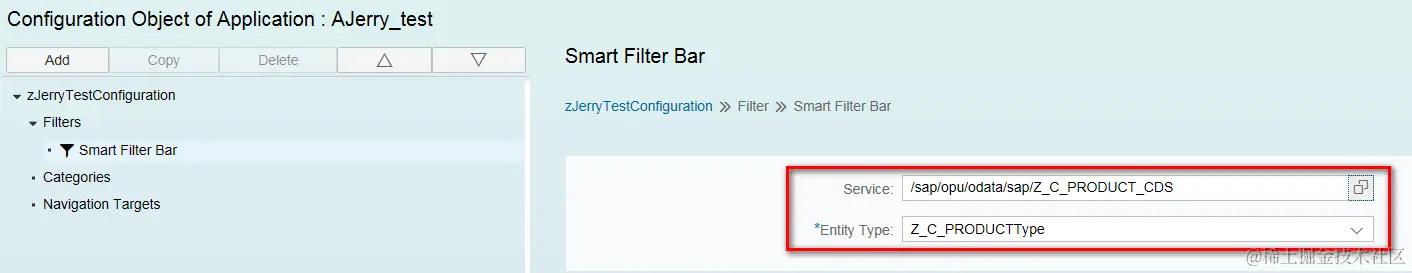 For Smart Filter Bar, specify the OData service published by CDS view we just create: