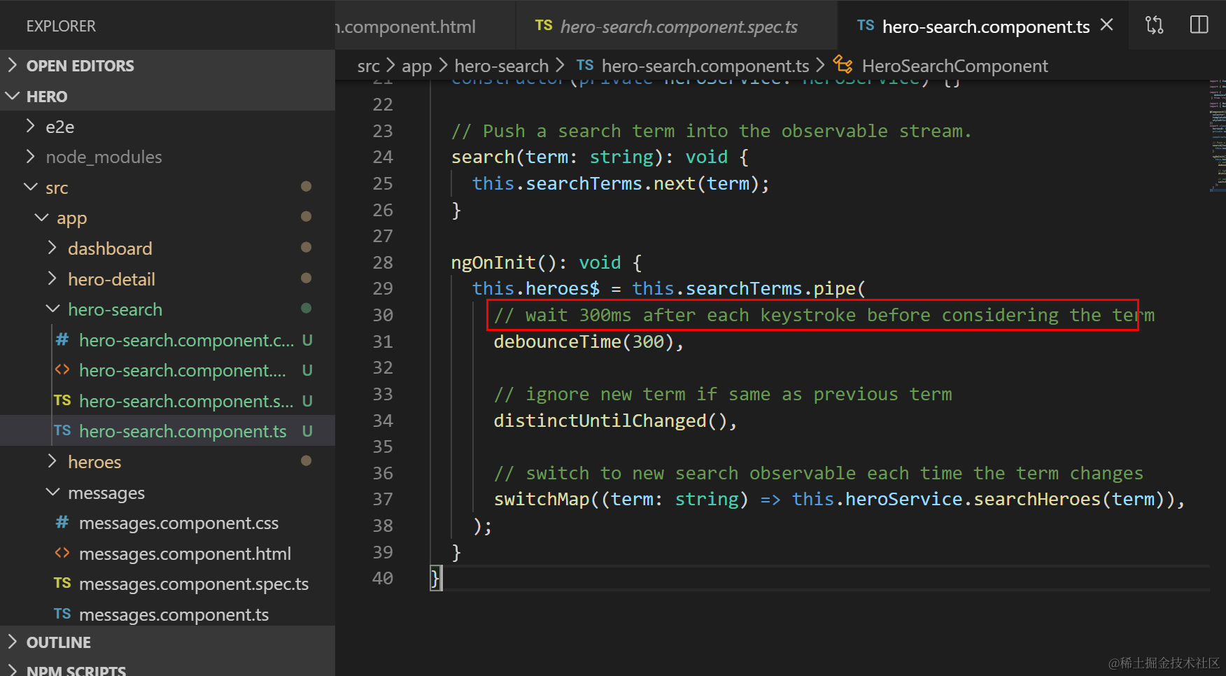 - debounceTime(300): waits until the flow of new string events pauses for 300 milliseconds before passing along the latest string. You’ll never make requests more frequently than 300ms. 新的input事件在300毫秒之后才会触发。