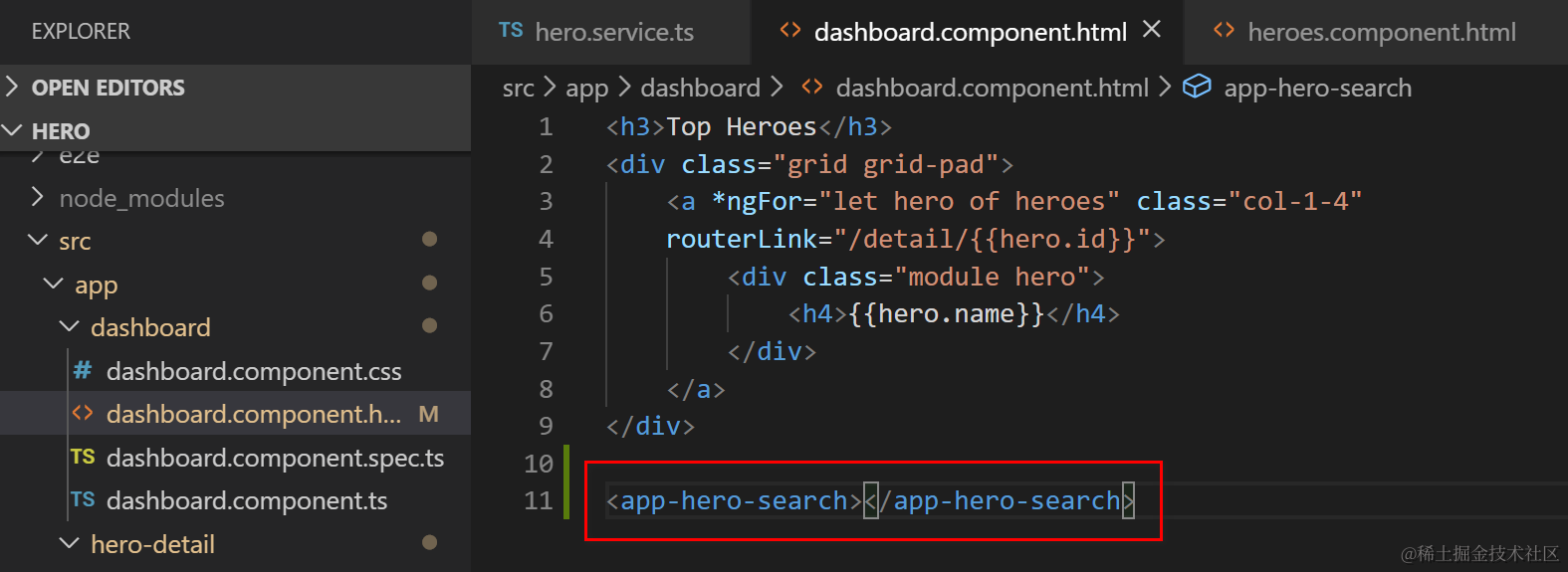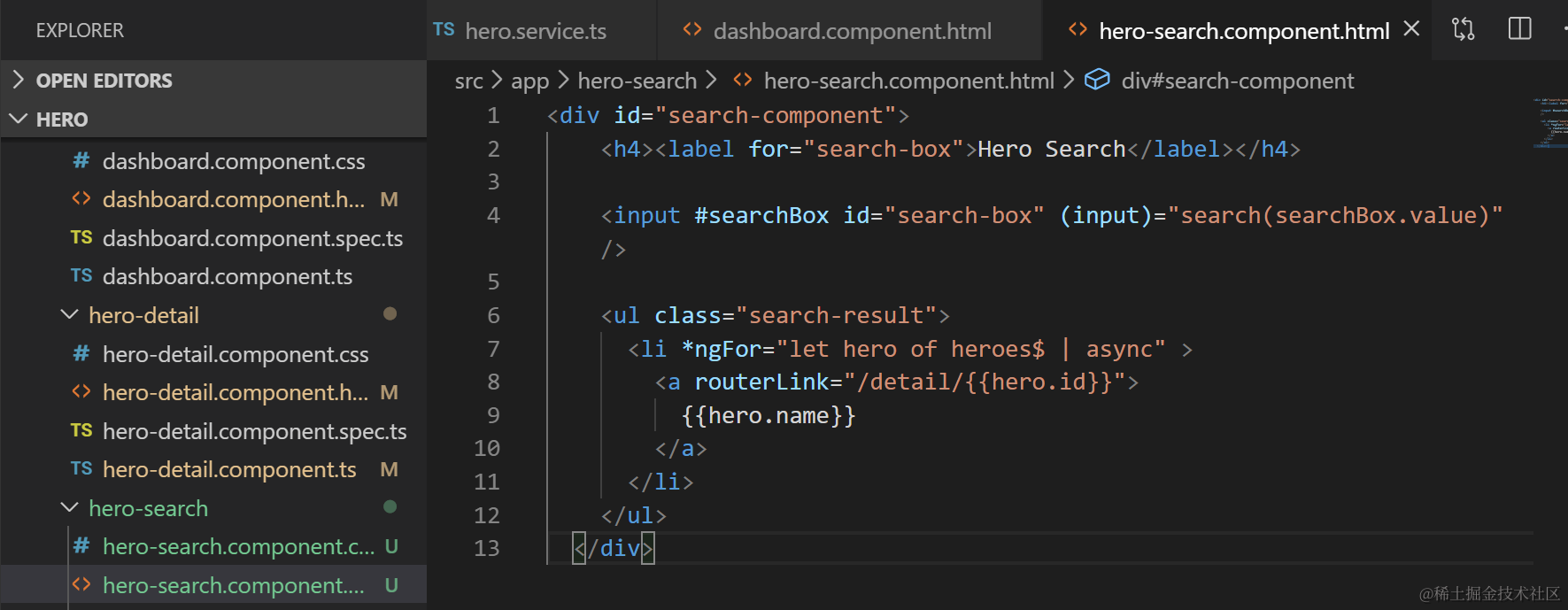 Notice that the *ngFor iterates over a list called heroes$, not heroes. The $ is a convention that indicates heroes$ is an Observable, not an array.