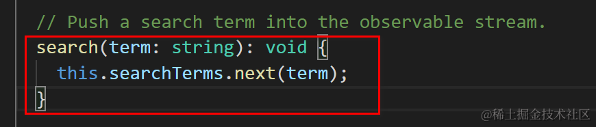 将用户输入的term字符串变量放入searchTerms这个observable stream中。
