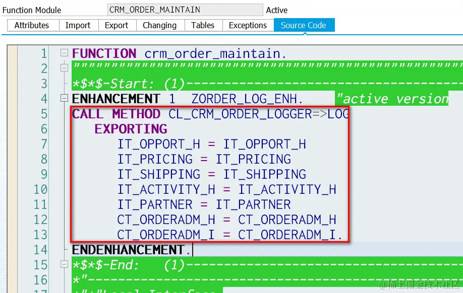 (5) I create an enhancement on function module CRM_ORDER_MAINTAIN to inject my logger API there: