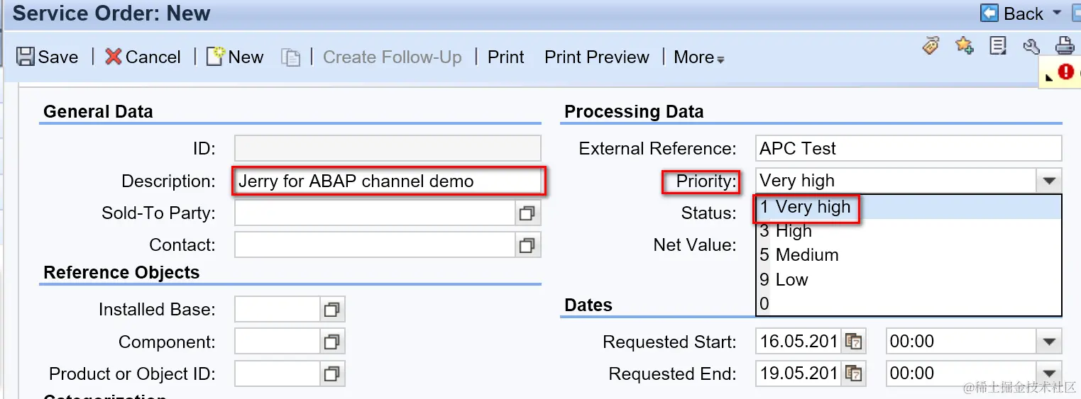 In my example, I create a new service order, and maintain fields like Description, External Reference, Priority, Pricing Date and Currency.