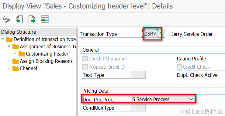 The document pricing procedure for my own transaction type ZSRV is maintained as S: