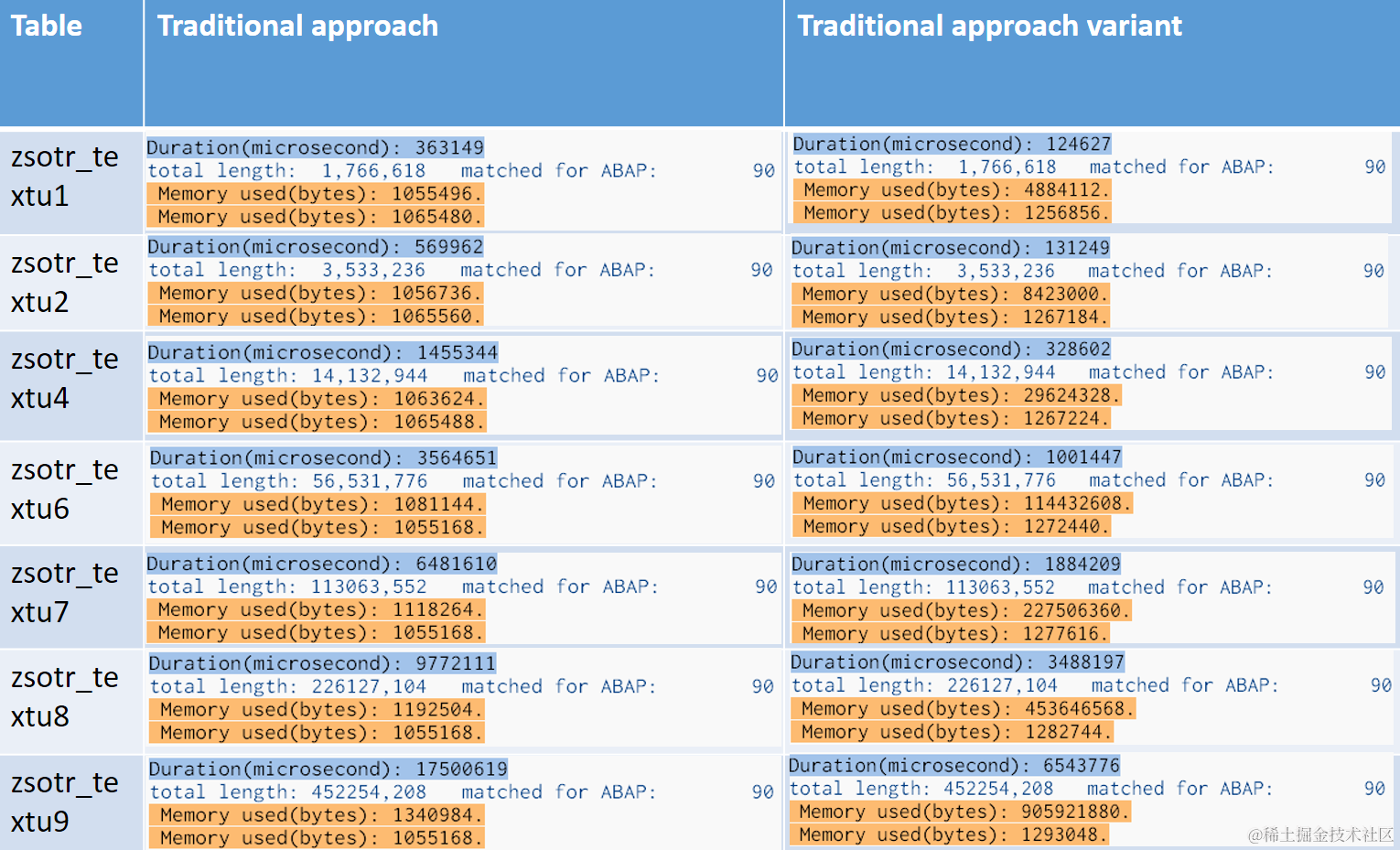 the total length should be 5 * 3 = 15 and number of records whose Text fields has pattern “ABAP” is 2.