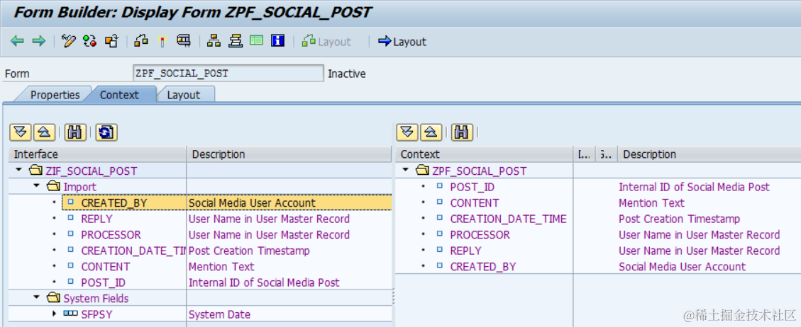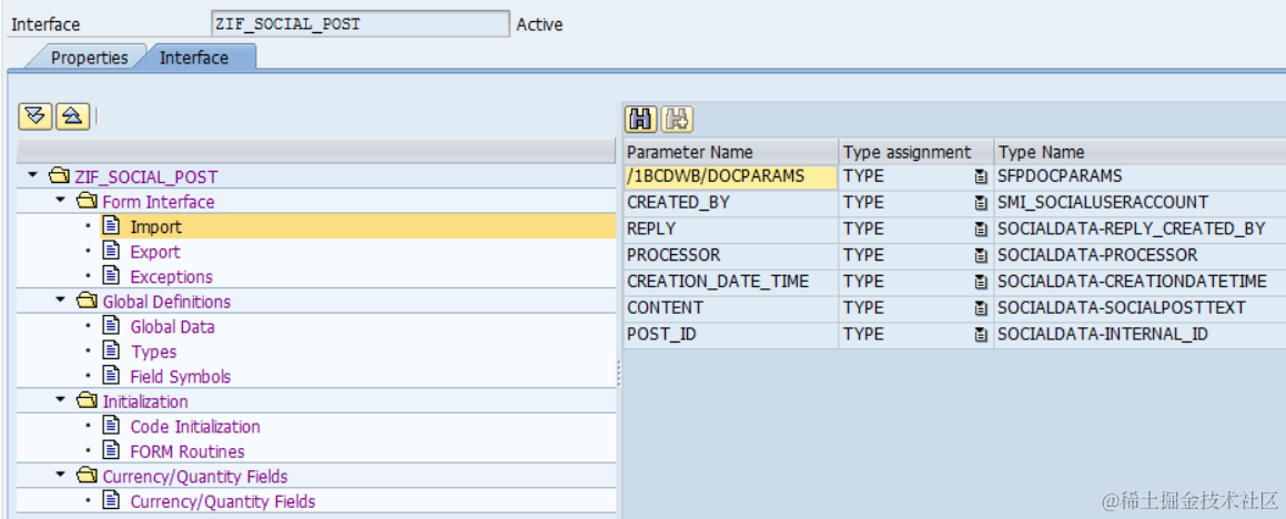 (1) A form interface ZIF_SOCIAL_POST. This interface declares importing signature which will be filled by the PDF consumer with business data.
