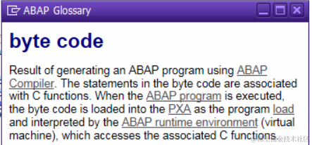 Result of generating an ABAP program using ABAP Compiler. The statements in the byte code are associated with C functions. When the ABAP program is executed, the byte code is loaded into the PXA as the program load and interpreted by the ABAP runtime environment (virtual machine), which accesses the associated C functions.