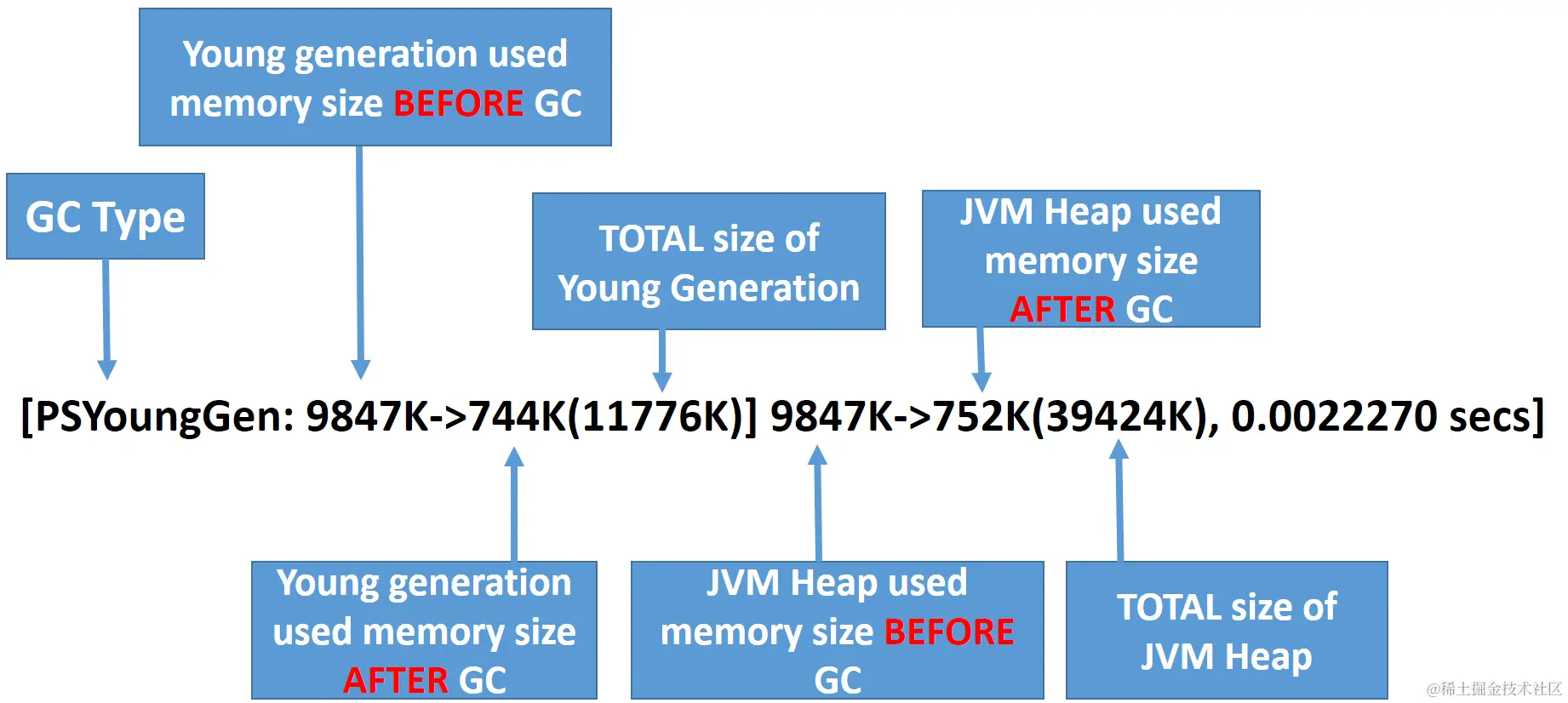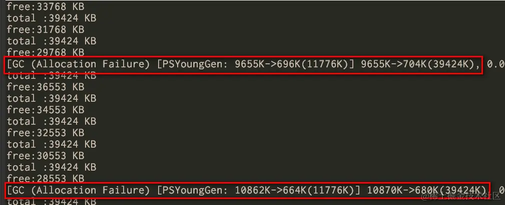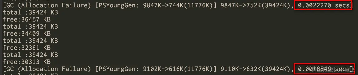 Let’s analyze the log: [GC (Allocation Failure) [PSYoungGen: 9847K->744K(11776K)] 9847K->752K(39424K), 0.0022270 secs]