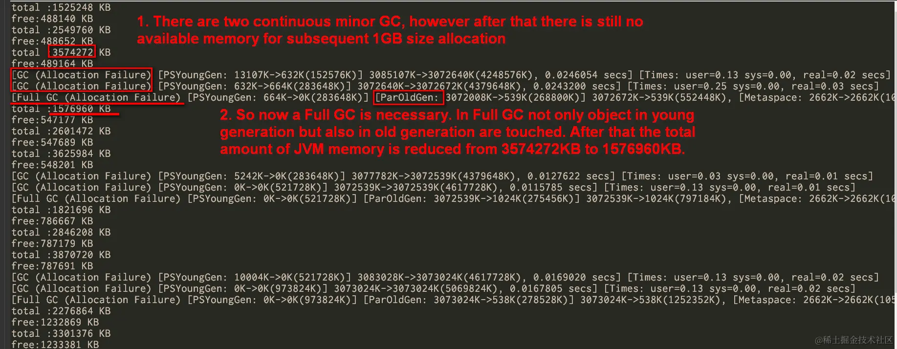 The Young Generation is where all new objects are allocated and aged. When the young generation fills up, this causes a minor garbage collection. This GC could be observed in our log that once GC is done, the free space size in young generation increases greatly.