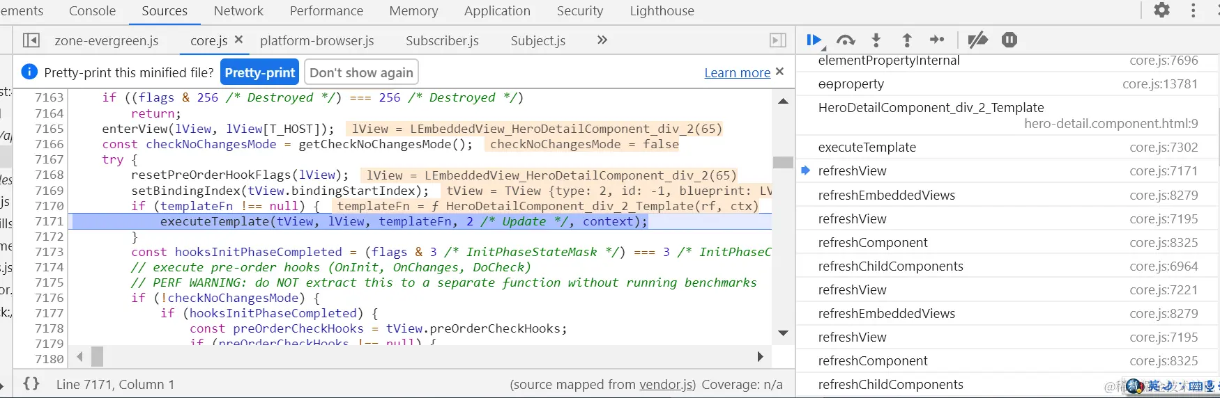 可以看到一大堆以refresh开头的Angular框架方法,这些就是Angular视图change detect的实现: