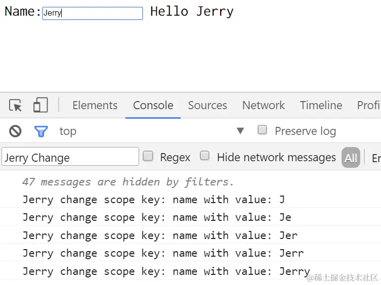 Every time you type character in the input field, the content of String Template will react to this change and refresh itself. If you open F12 in Chrome development, you can observe the following trace when “Jerry” is typed.