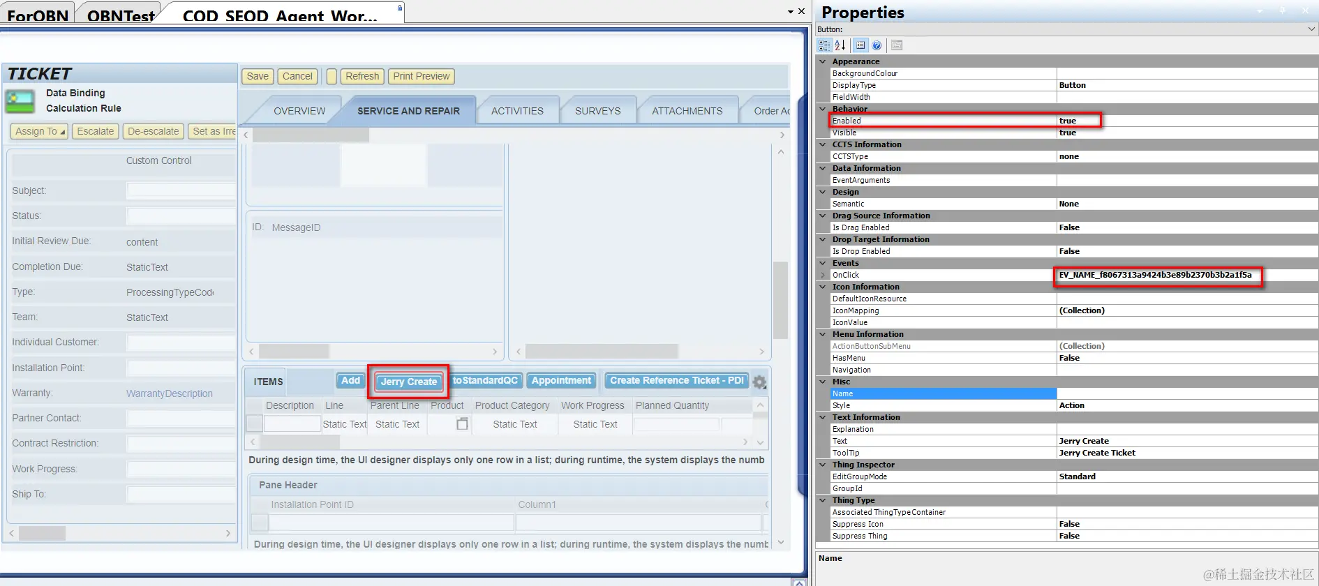 (2) The enable property of OBN button is bound to the automatically generated data model field, whose path is/EventHandler/EV_NAME_f8067313a9424b3e89b2370b3b2a1f5a.Enabled.