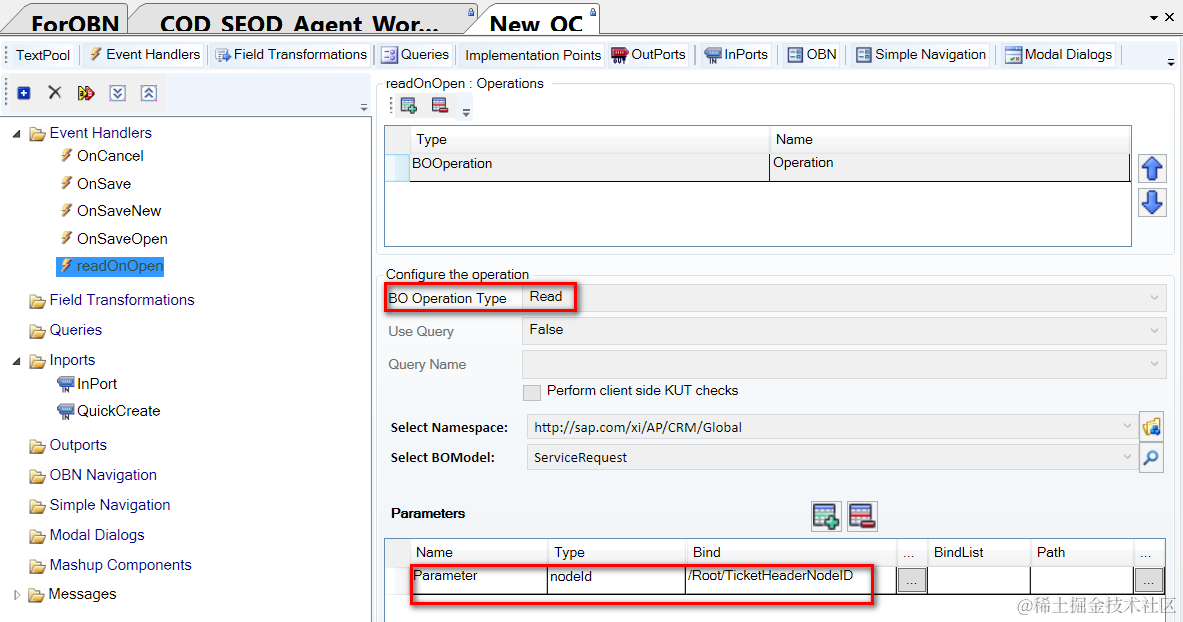 Create a new event handler to read the Service Request BO instance data by using “TicketHeaderNodeID” as parameter: