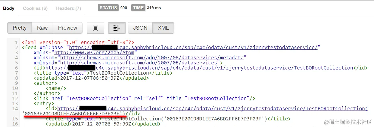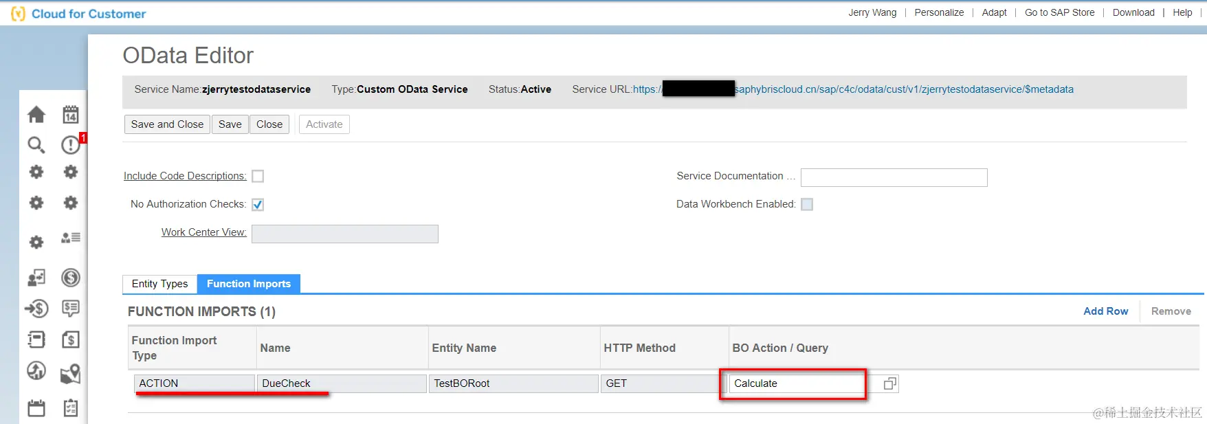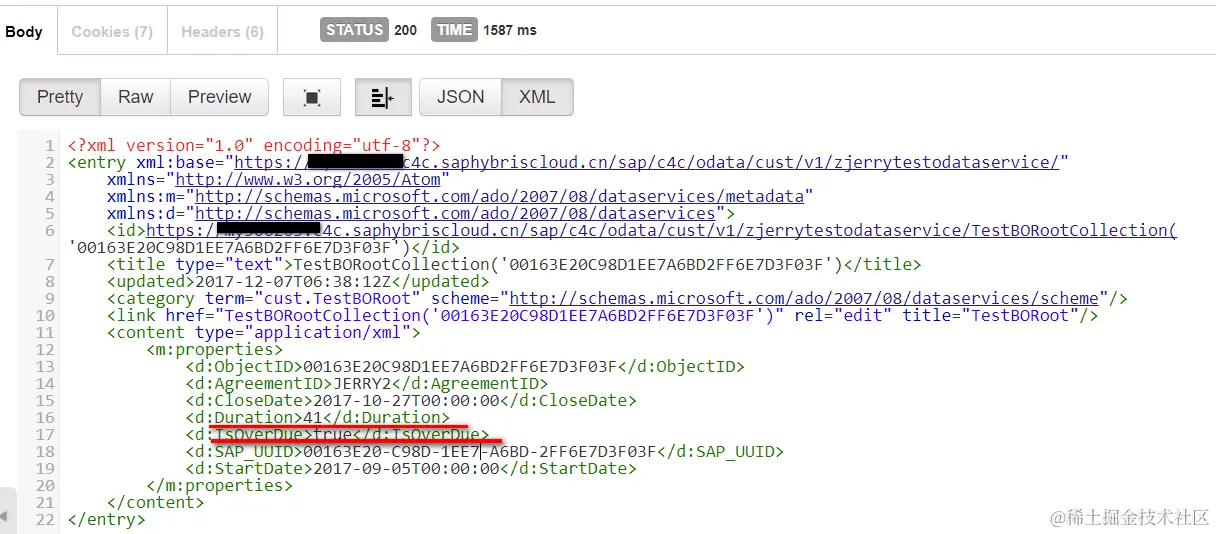 Then execute the url appended with the object id found in previous step plus the function import name: https:///sap/c4c/odata/cust/v1/zjerrytestodataservice/DueCheck?ObjectID=’00163E20C98D1EE7A6BD2FF6E7D3F03F’, and the BO action is successfully executed: you could observe the flag isOverDue and field Duration are correctly calculated and returned by this OData service.