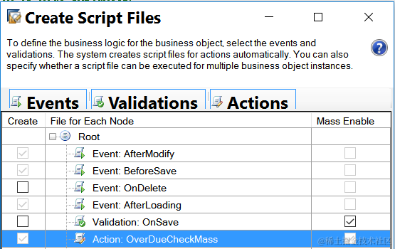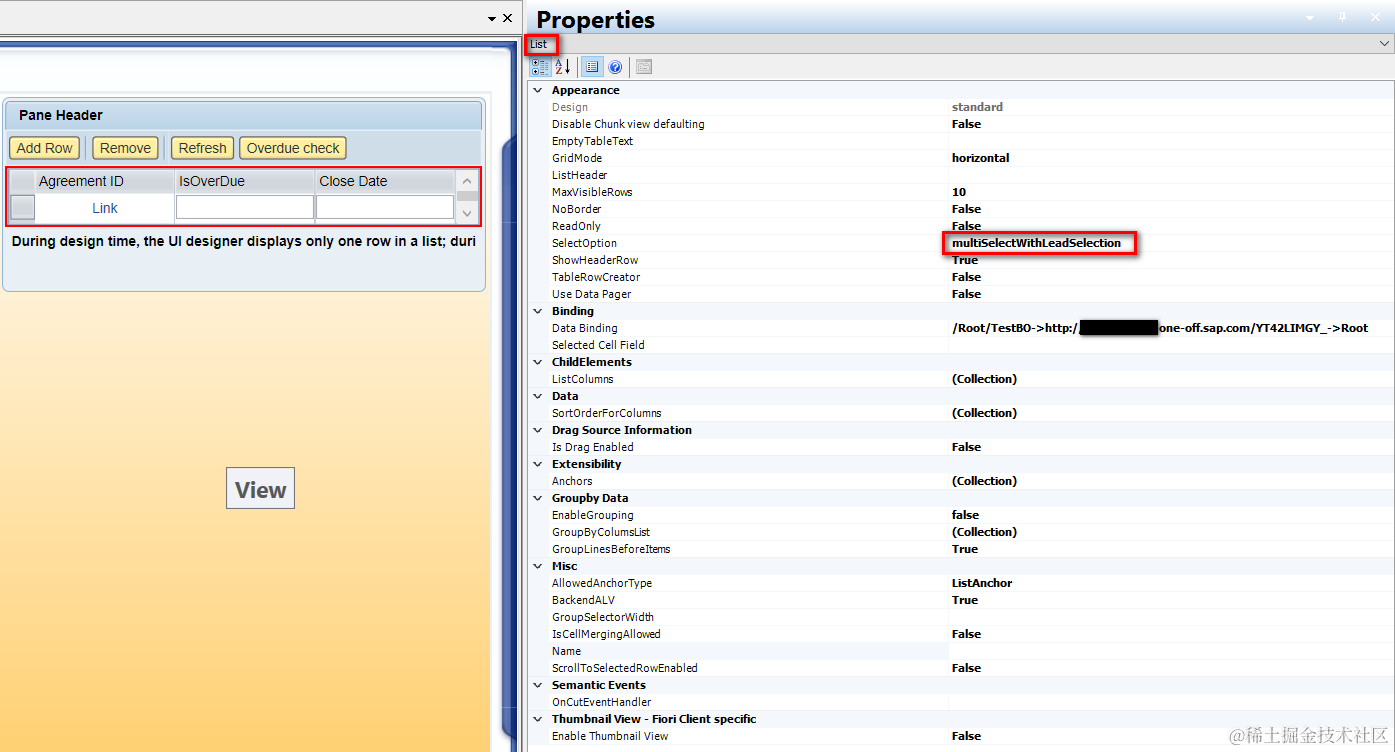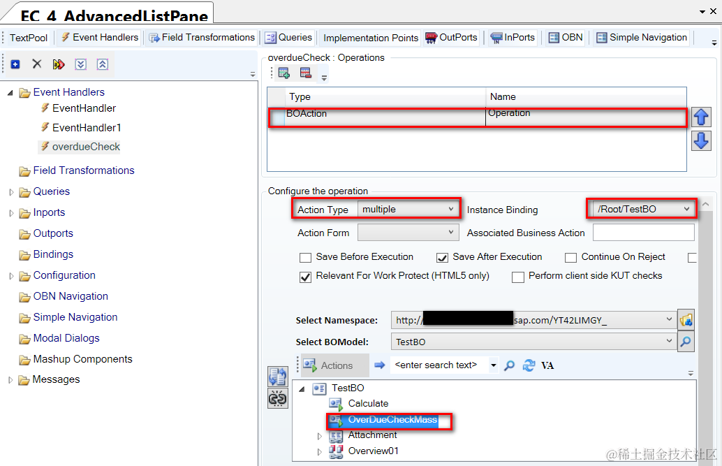 (2) Create an event handler with type BOAction. For instance Binding attribute, bind it to the Data List created in previous step. Choose “multiple” as Action Type and bind this event handler to BO Action OverDueCheckMass.