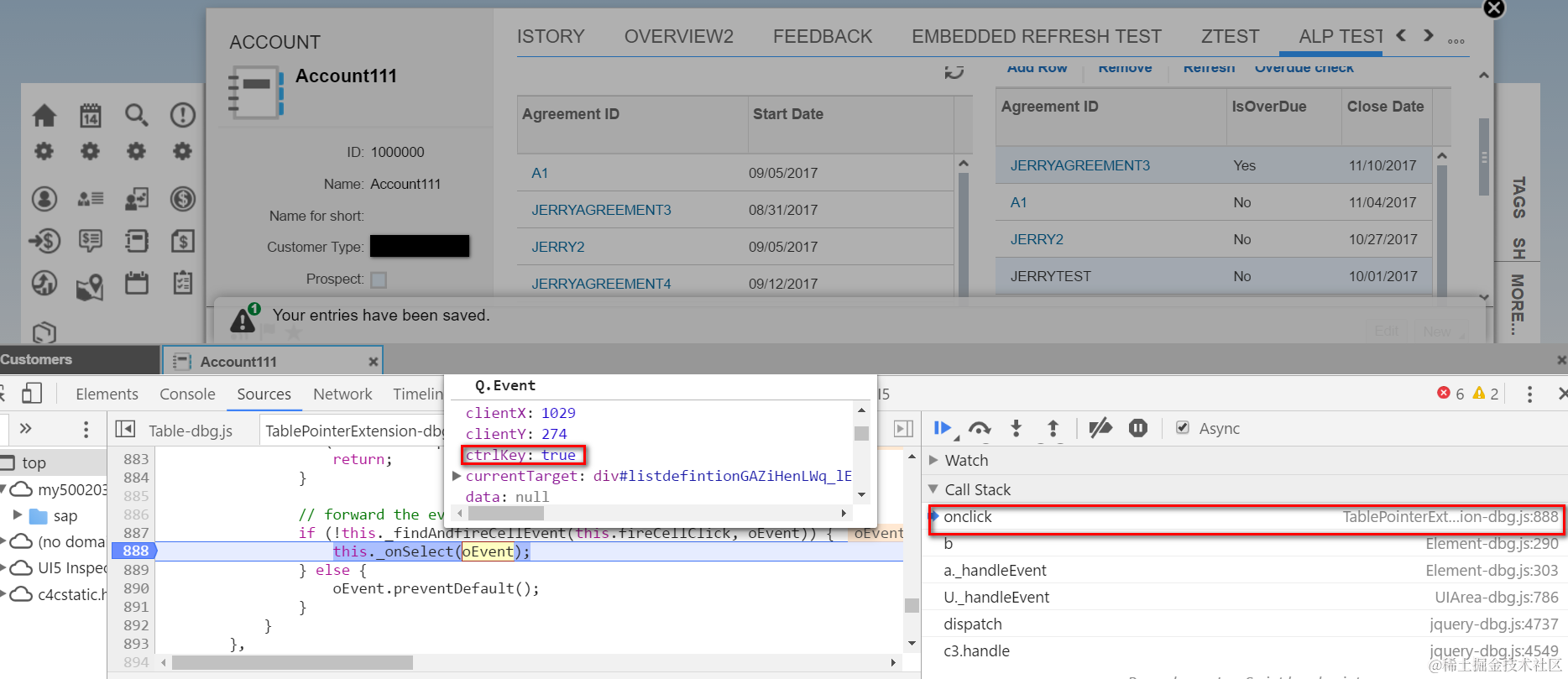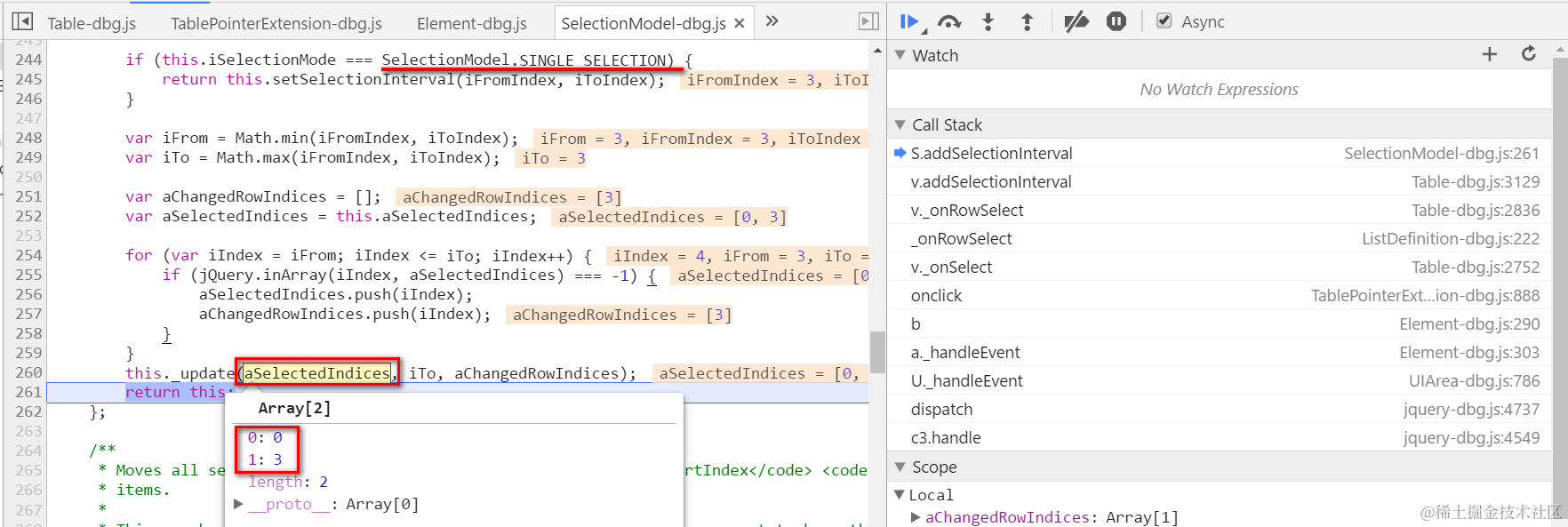Now when you click Overdue Check button with the state that first and fourth rows are selected, the breakpoint set in method SendAsyncPostRequest in file Request.js will be triggered. Check what exactly the data will be sent to backend by inspecting variable mParameters: