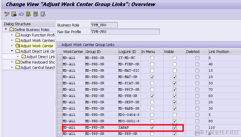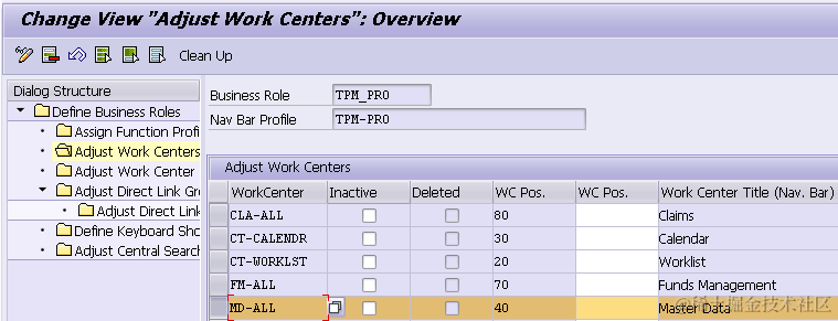 Choose business role TPM-PRO, and double click on “Adjust work centers”, and technical name “MD-ALL” is identified.
