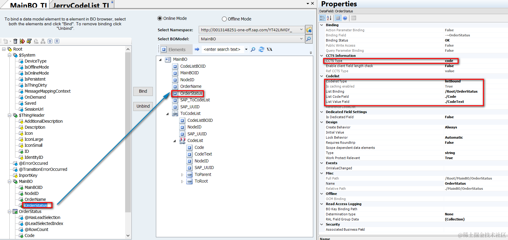 The OrderStatus field in Data structure should be bound to BO field OrderStatus as well. And the CCTS Information and CodeList properties for the data field should be set as below.