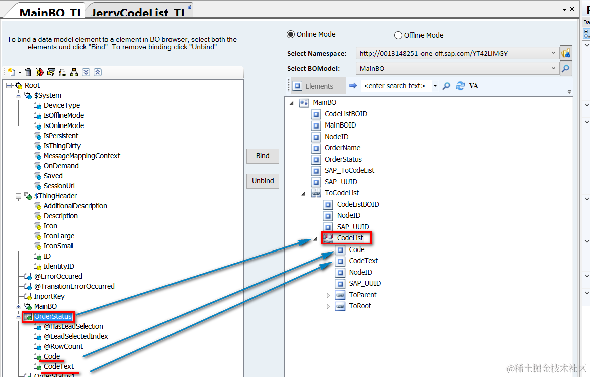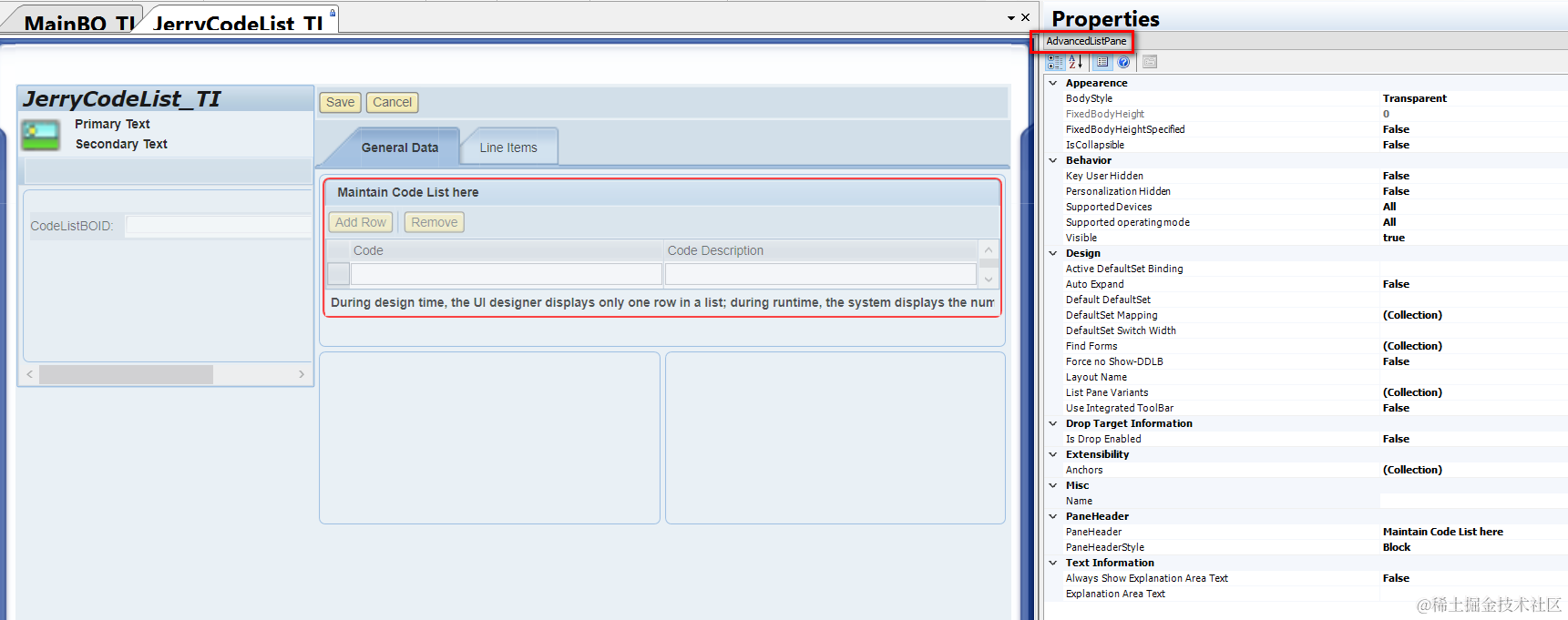 (3) In the Thing Inspector UI of the host BO, create a new Data List and bind it to the CodeList node in BO model. Bind data field Code and CodeText accordingly as displayed in the screenshot below.