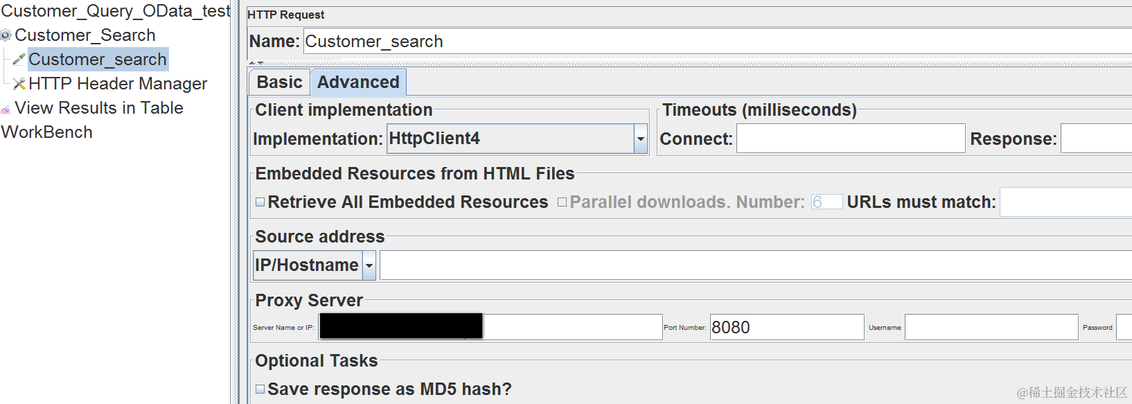 Switch to Advanced tab, choose “HttpClient4” from drop down list for Implementation, and maintain proxy server name and port number.