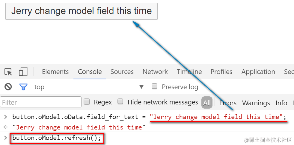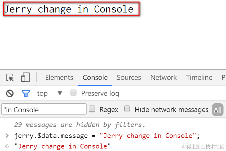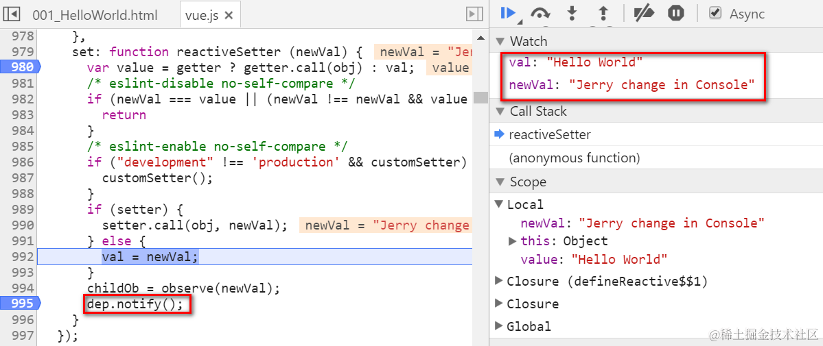 the old value “Hello World” is overwritten by the new value “Jerry change in Console”, and dep.notify will trigger the very control involved in this model change: