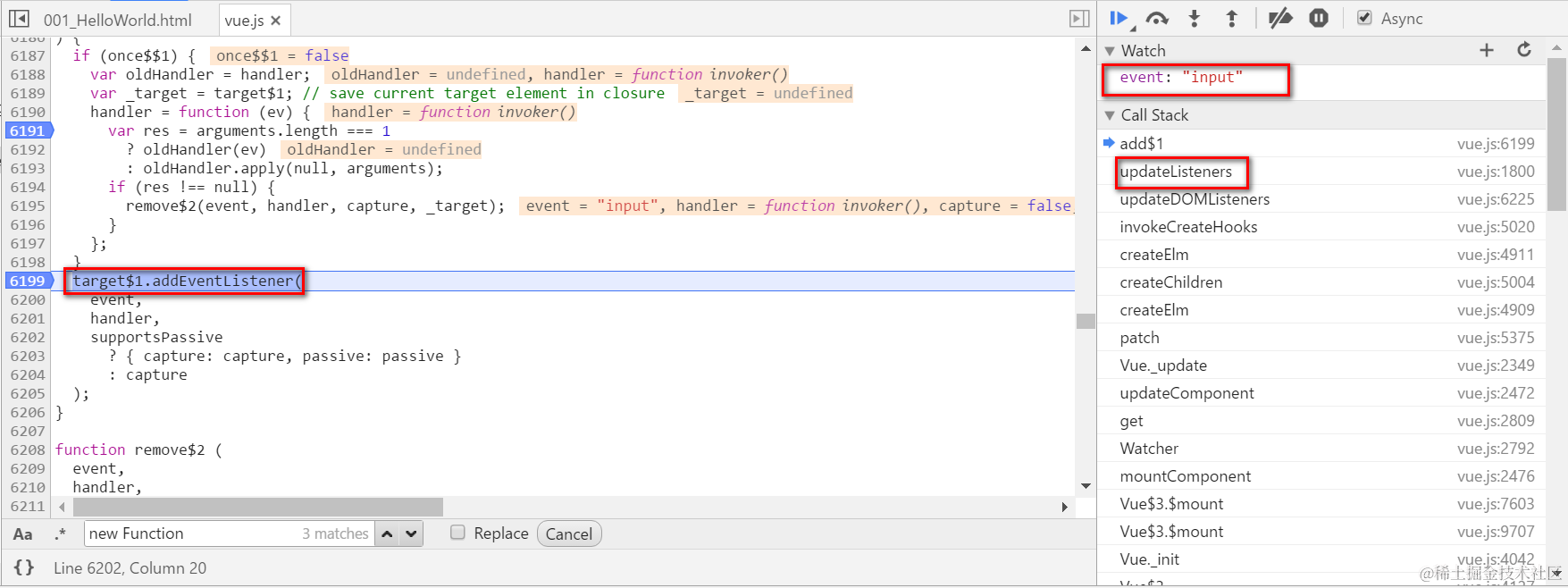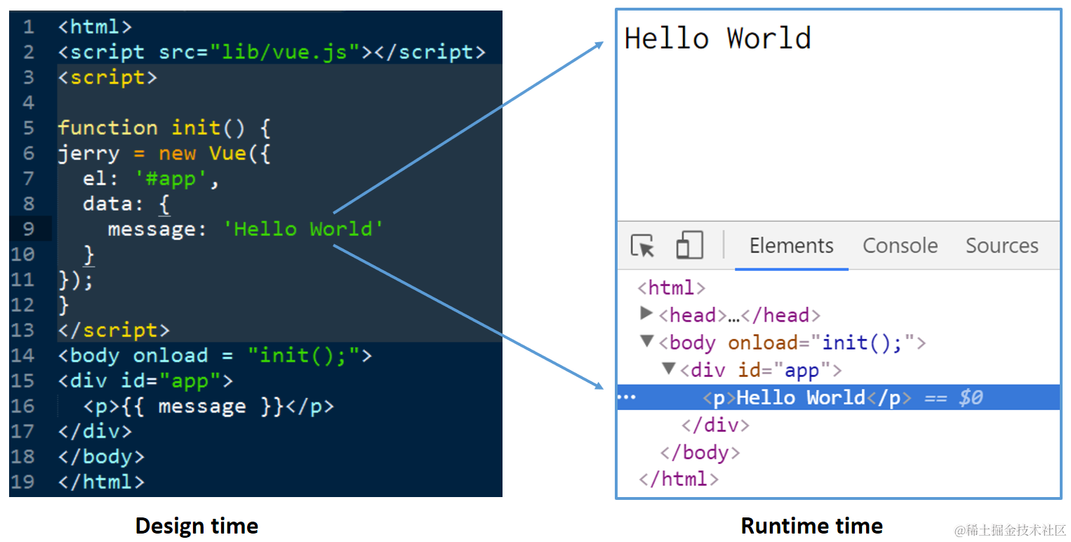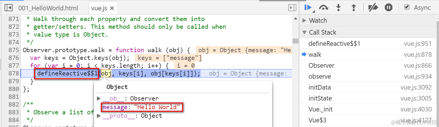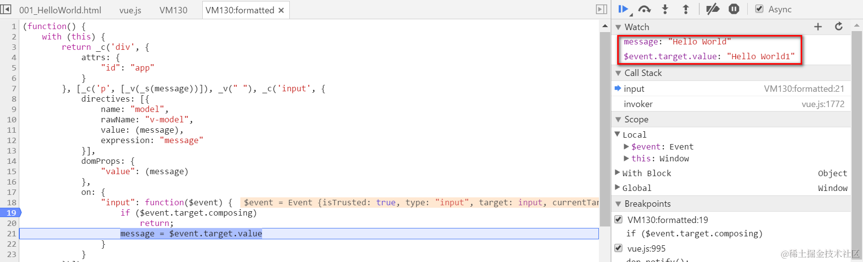 I am just using the hello world example provided in Vue tutorial to inspect its two way data binding trait.