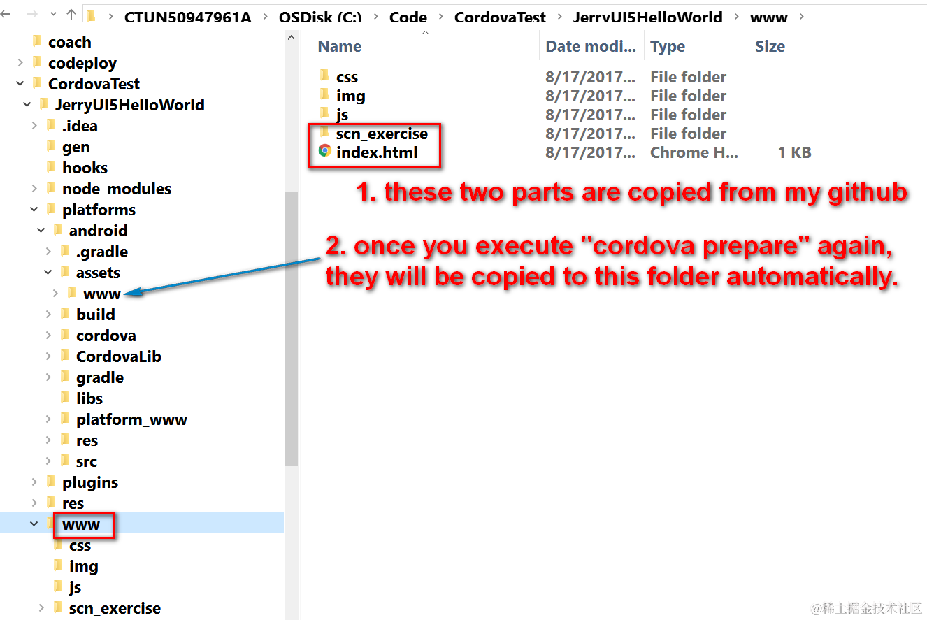 (5) By default there is a dummy index.html file existing in folder www. Using command cordova prepare, the index.html will be copied automatically to folder platforms\android\assets\www. So the general idea here is we always develop the artifacts of our web application in www folder. Once done, use cordova prepare to synchronize it to android platform related folder.