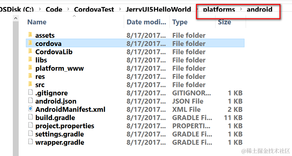Once done, the necessary artifacts (Android platform specific) for APK generation are created under folder platforms/android.