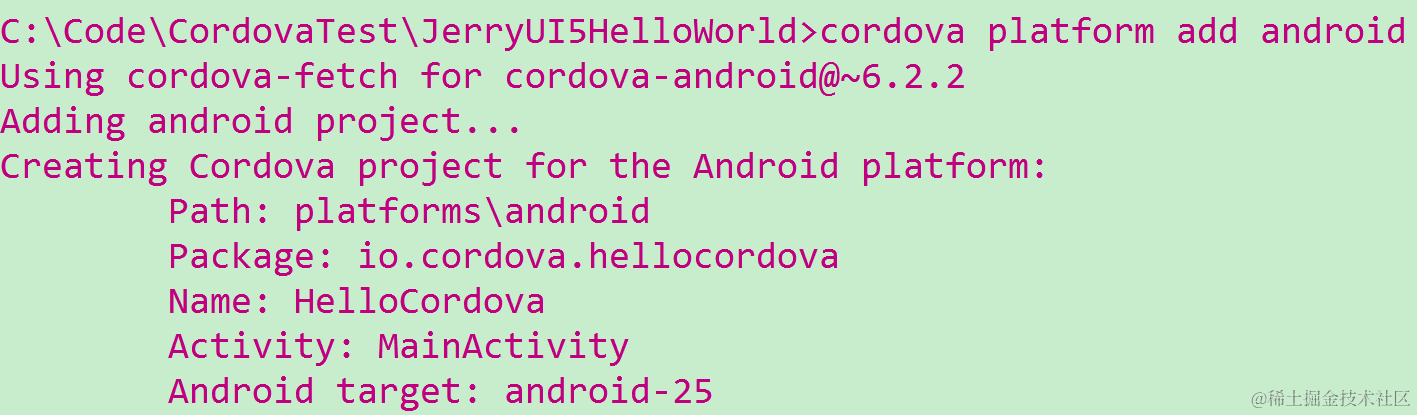 (4) Add android platform support via command: cordova platform add android