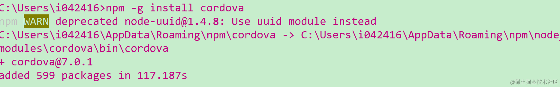 (2) Install Cordova via npm -g install cordova: