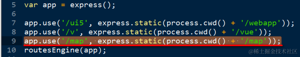 (3) Add one line below in server.js, to support route based on url /map to the created folder in step one.