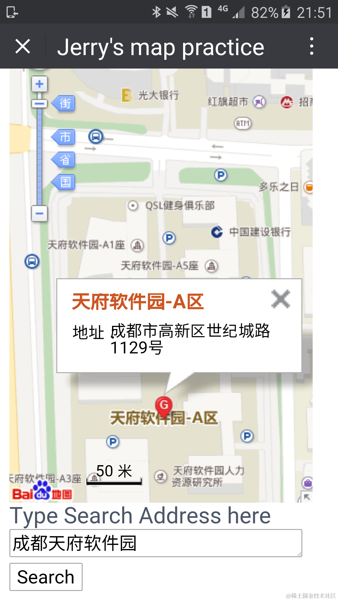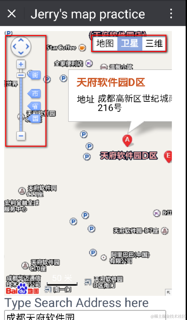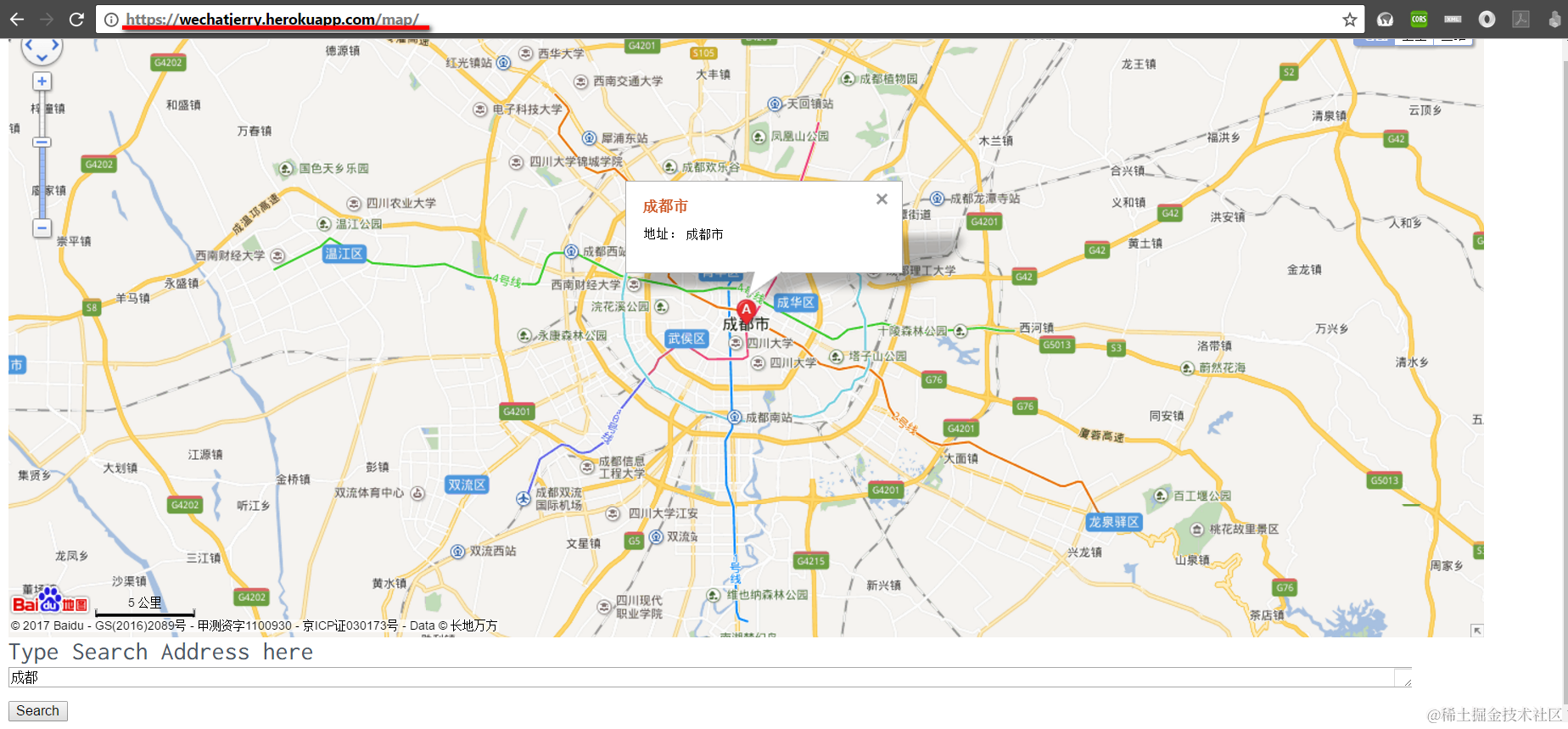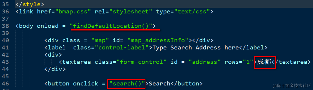 I didn’t use any frontend framework to make this example simple and easily understood. When the map view is initially rendered, onload function findDefaultLocation() will be fired to locate the hard coded address “成都” in the map. End user can also change this address maintained in textarea and press search button to locate new address, implemented by function search().
