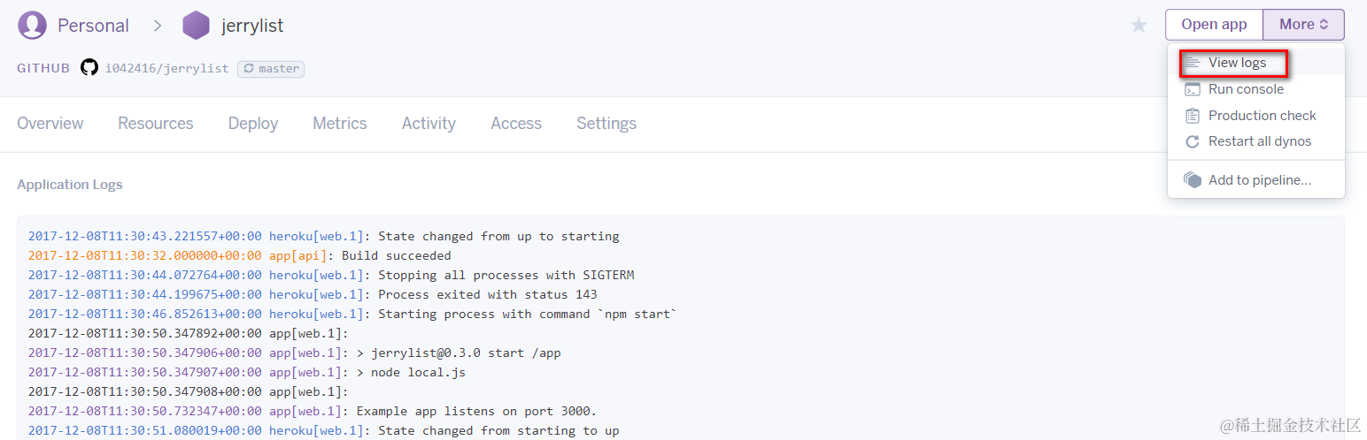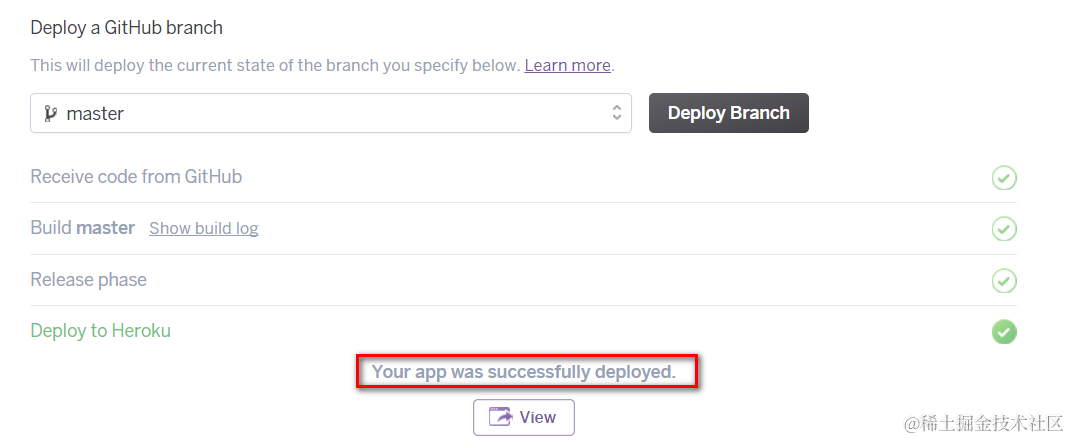 Click button “Deploy Branch” to deploy the master branch to the Heroku application: