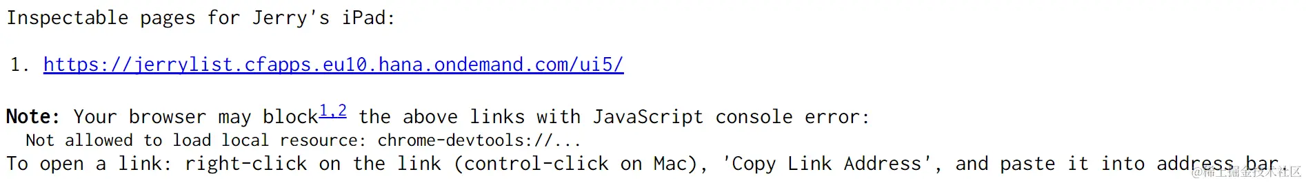 Click the hyperlink “localhost:9222”, then the active Safari page which displays my UI5 application is listed there: