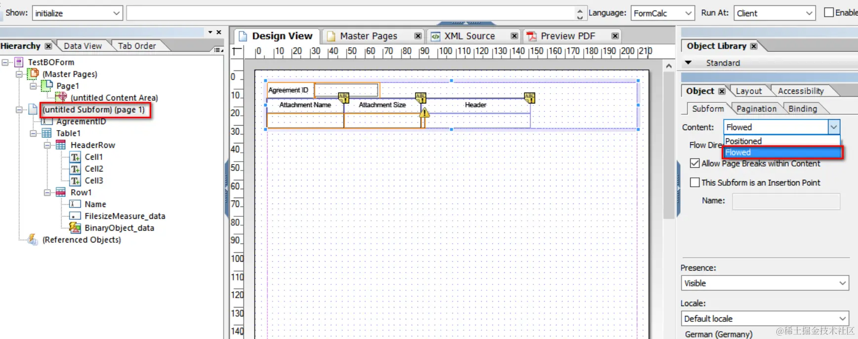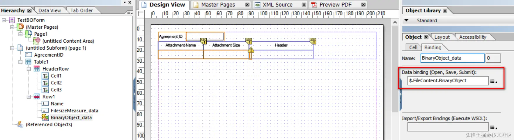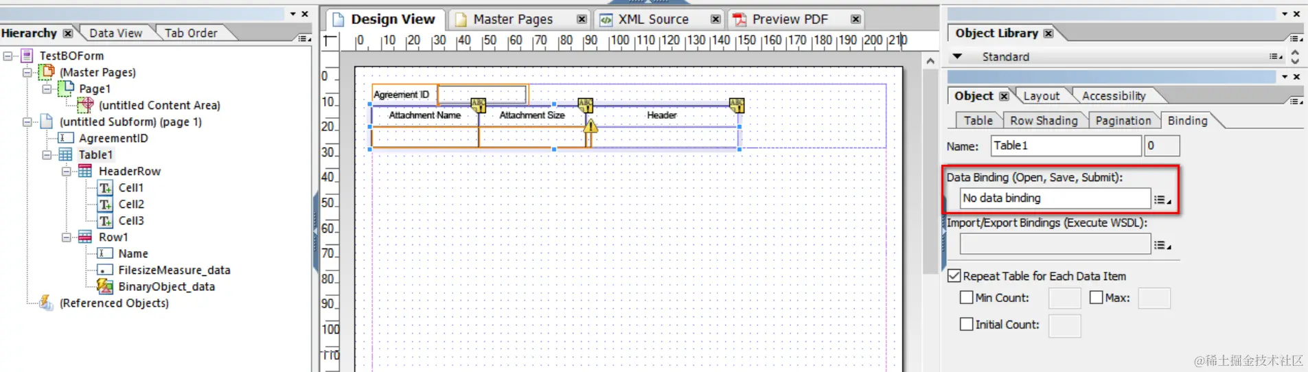 Select table row node, bind it to path: $.TestBO.Attachment.DocumentList[*] and mark the checkbox “Repeat Row for Each Data Item”: