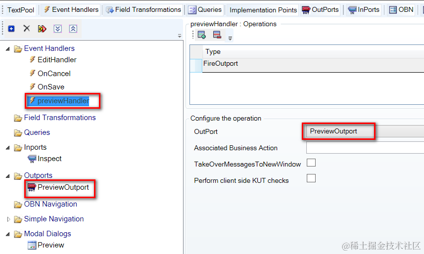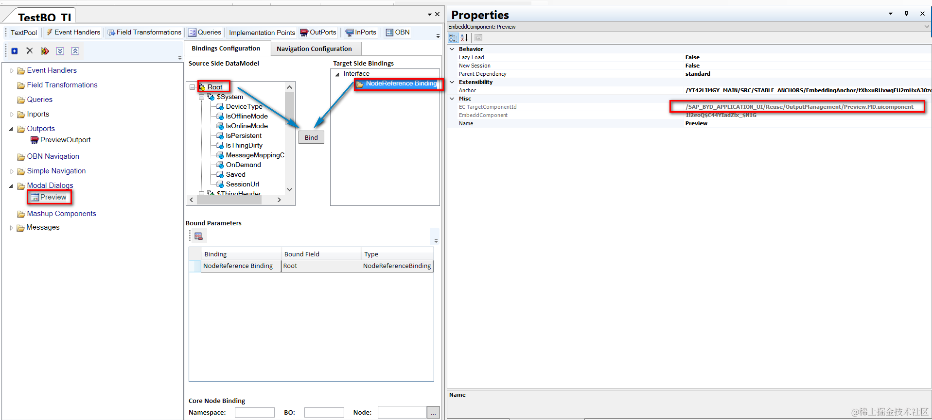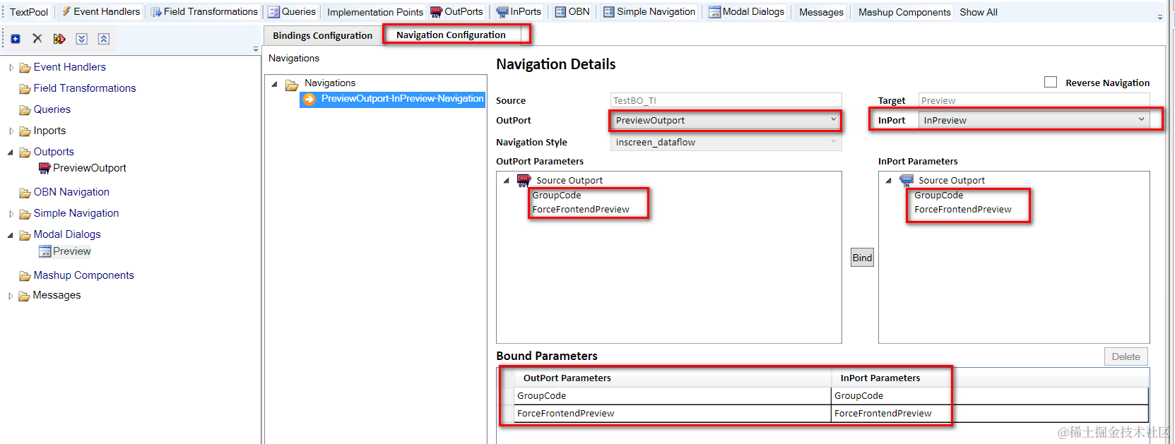 Switch to Navigation Configuration tab of selected Modal Dialog, bind the created outport before of our TI with the standard inport InPreview of Reusable UI. Bind their parameters as well.