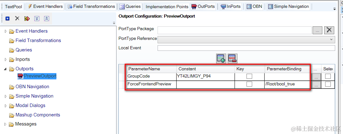 Create a new Output named PreviewOutput, and create two Parameters named “GroupCode” and “ForceFrontendPreview”. The corresponding parameter could be found below.