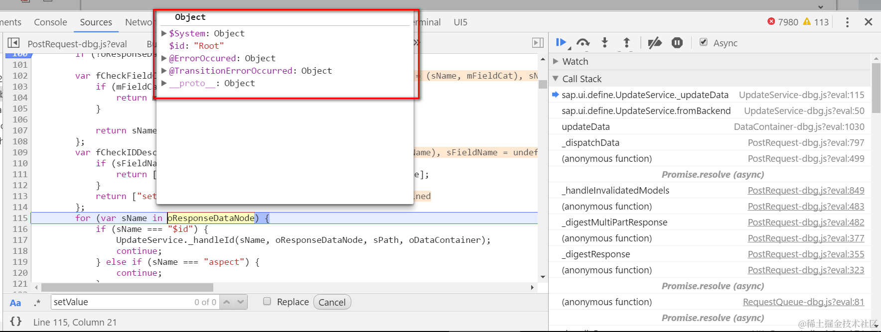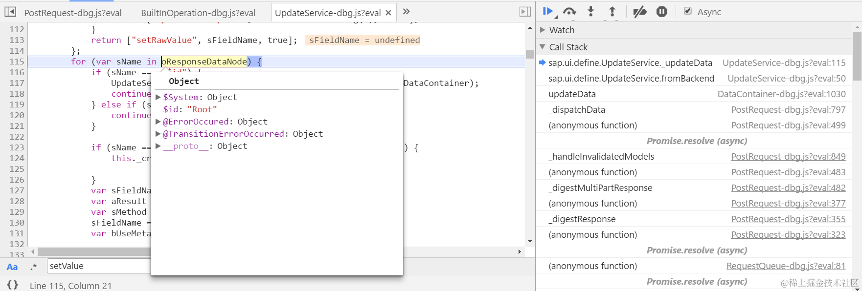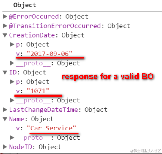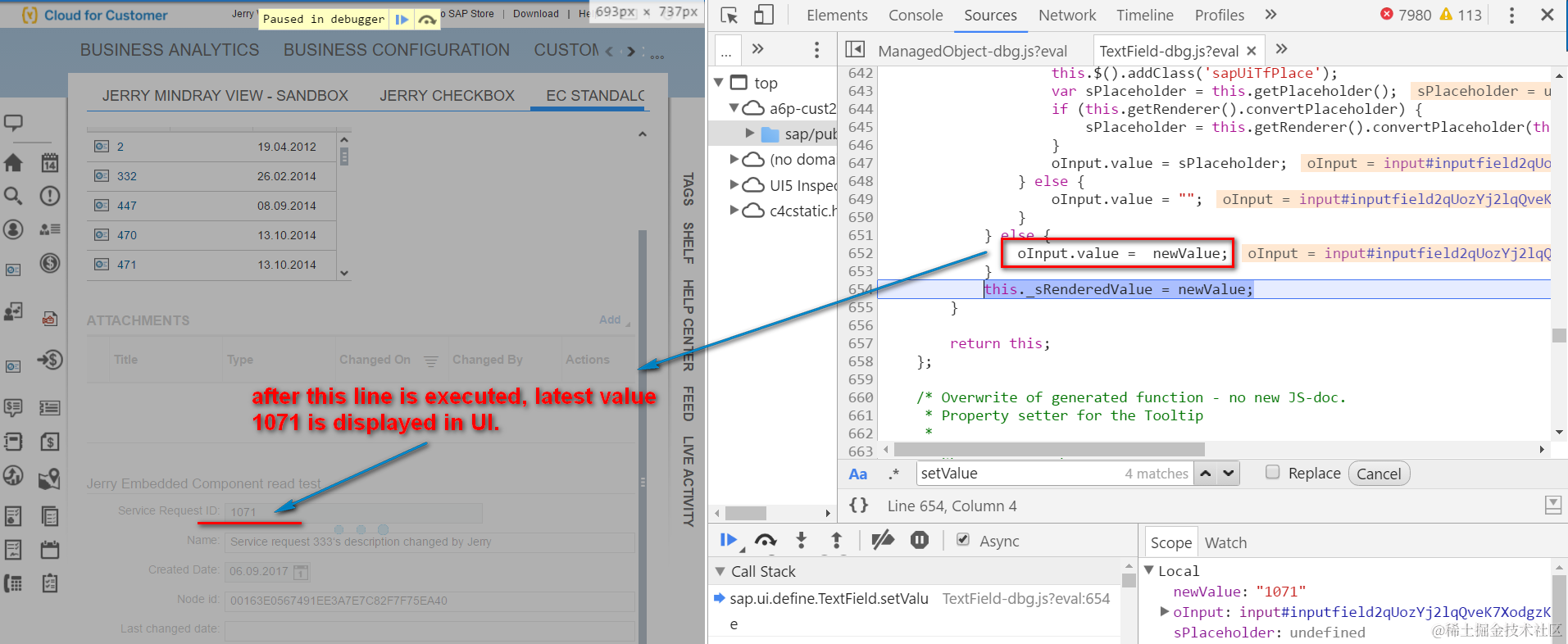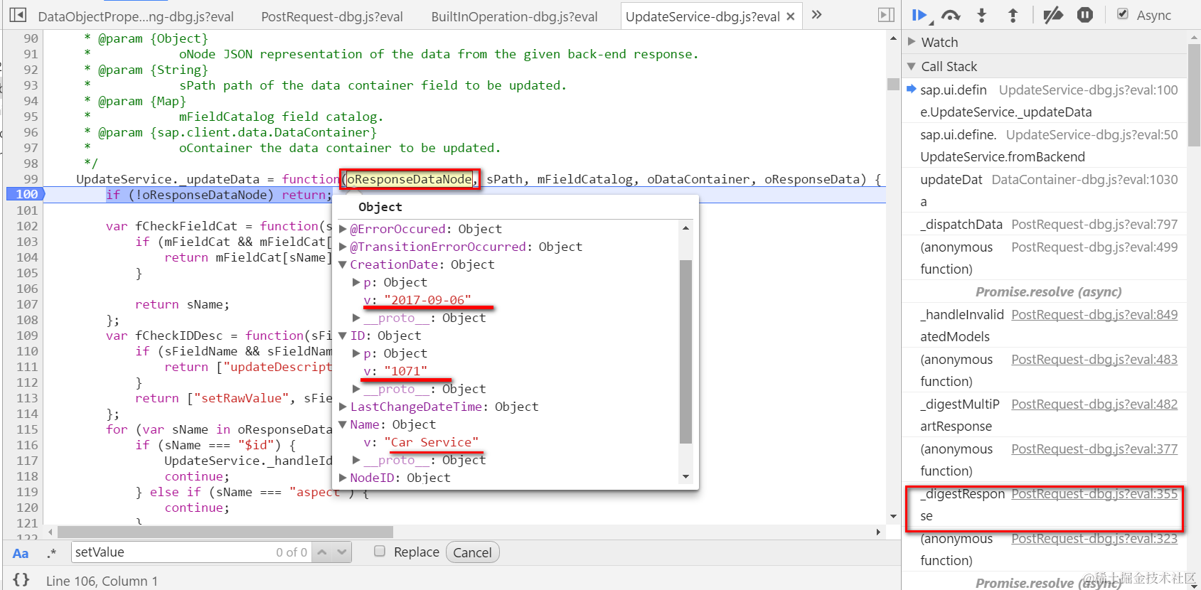 (2) Set breakpoint on file UpdateService.js, function _updateData. Type ID 1071 and click button, the BO data will be read from backend. Once response is available, this function will be called. From debugger we can find out that the BO detail data is already contained in the response.