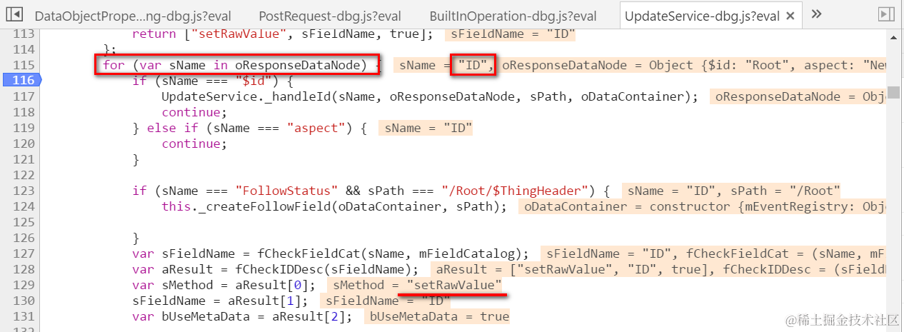 And there is a for loop performed on this data structure, to write the latest data back to UI controller’s corresponding model node field. Below screenshot shows the model field ID in Root node will be merged with the latest data, 1071.